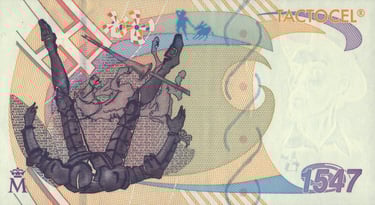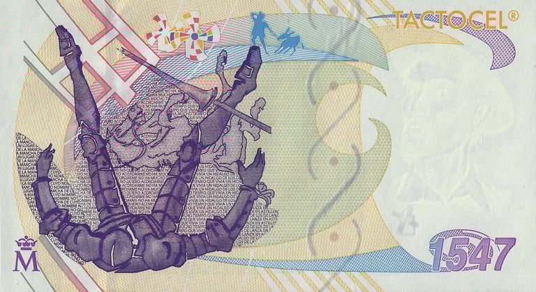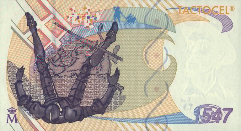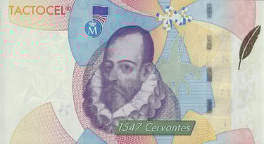 Tactocel Cervantes, 1547 año 2007. Anverso, busto de Cervantes y el año de nacimiento 1547. Reverso, viñeta alusiva a la caída de Don Quijote. Impreso por la Fábrica Nacional de Moneda y Timbre. Marca de agua: Busto de Don Quijote de la Mancha. Tamaño : 140 x 77 mm.