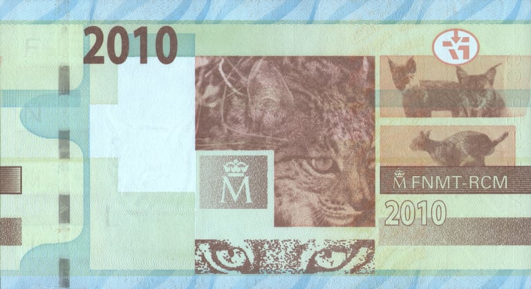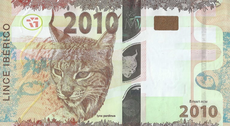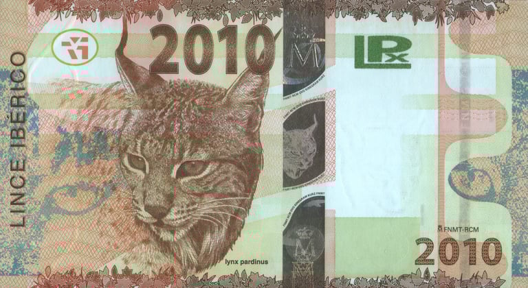 Lince Ibérico, año 2010. Ejemplares con “tactocel no definitivo y sin medida de seguridad “tinta OVI serigráfica. Anverso, el lince ibérico, (Lynx pardinus). Reverso, viñetas del lince ibérico, escudo (FNMT). Impresor: Fábrica Nacional de Moneda y Timbre.