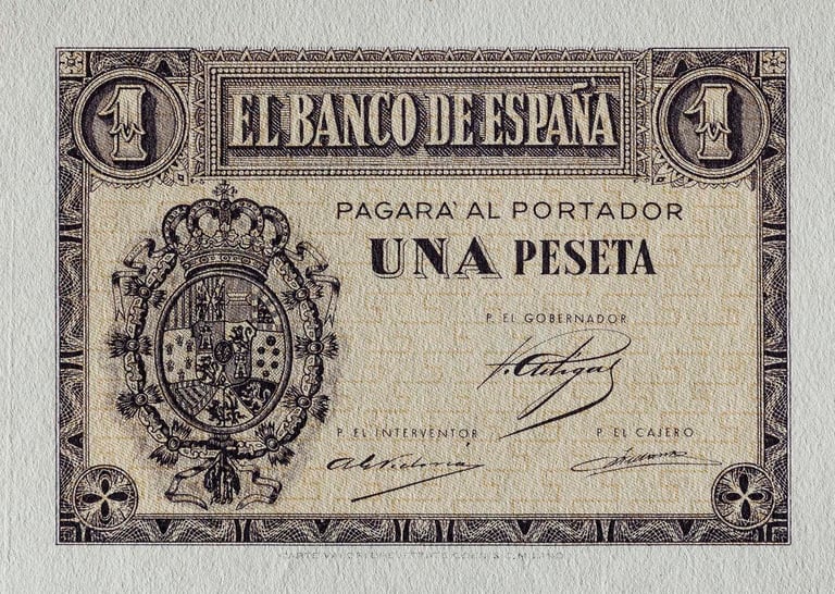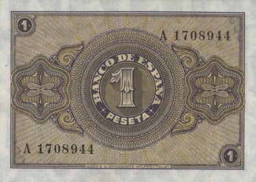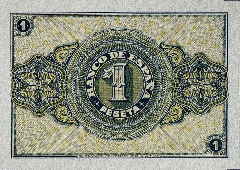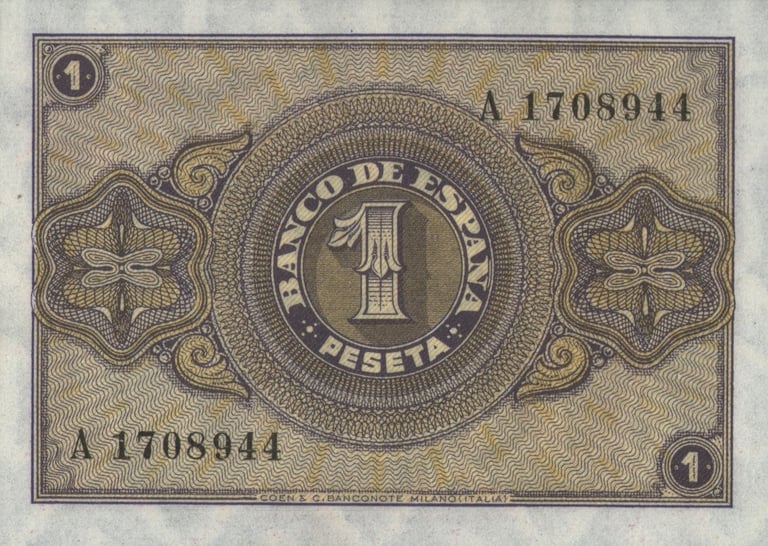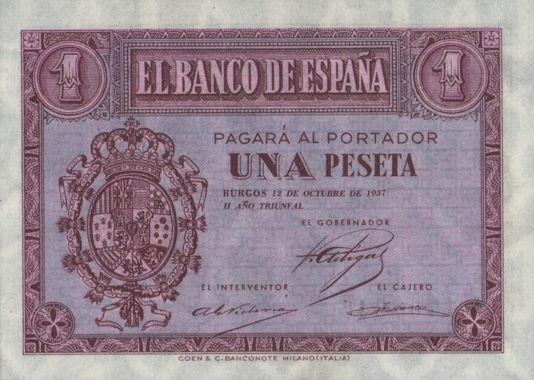 1 peseta, 12 de octubre de 1937. Burgos. Anverso, Escudo de Carlos III. Reverso, Banco de España, cifra del valor del billete. Impreso en litografía por Coen y Cartevalori, Milán.