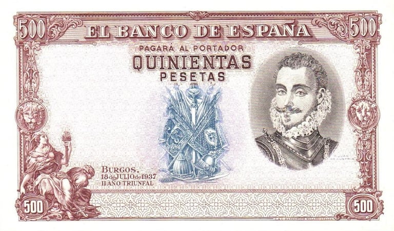 500 pesetas, 18 de julio de 1937. Burgos. Anverso, Don Juan de Austria. Impreso en calcografía y litografía. Impreso por Coen y Cartevalori, de Milán. No emitido.
