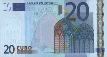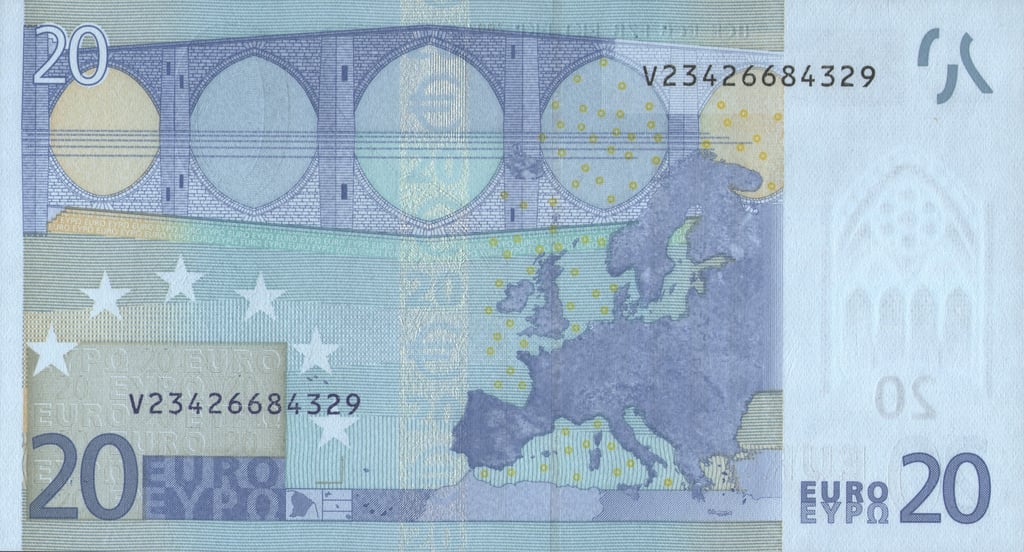 20 euro, 2002, Jean-Claude Trichet. Anverso, arco de arquitectura gótica. Reverso, un mapa de Europa y un puente de arquitectura gótica. Emisor, el Banco Central Europeo. Marca de agua: Arquitectura gótica. Diseñado por Robert Kalina, del Banco Nacional de Austria.