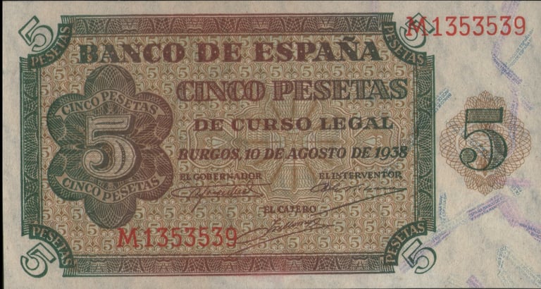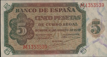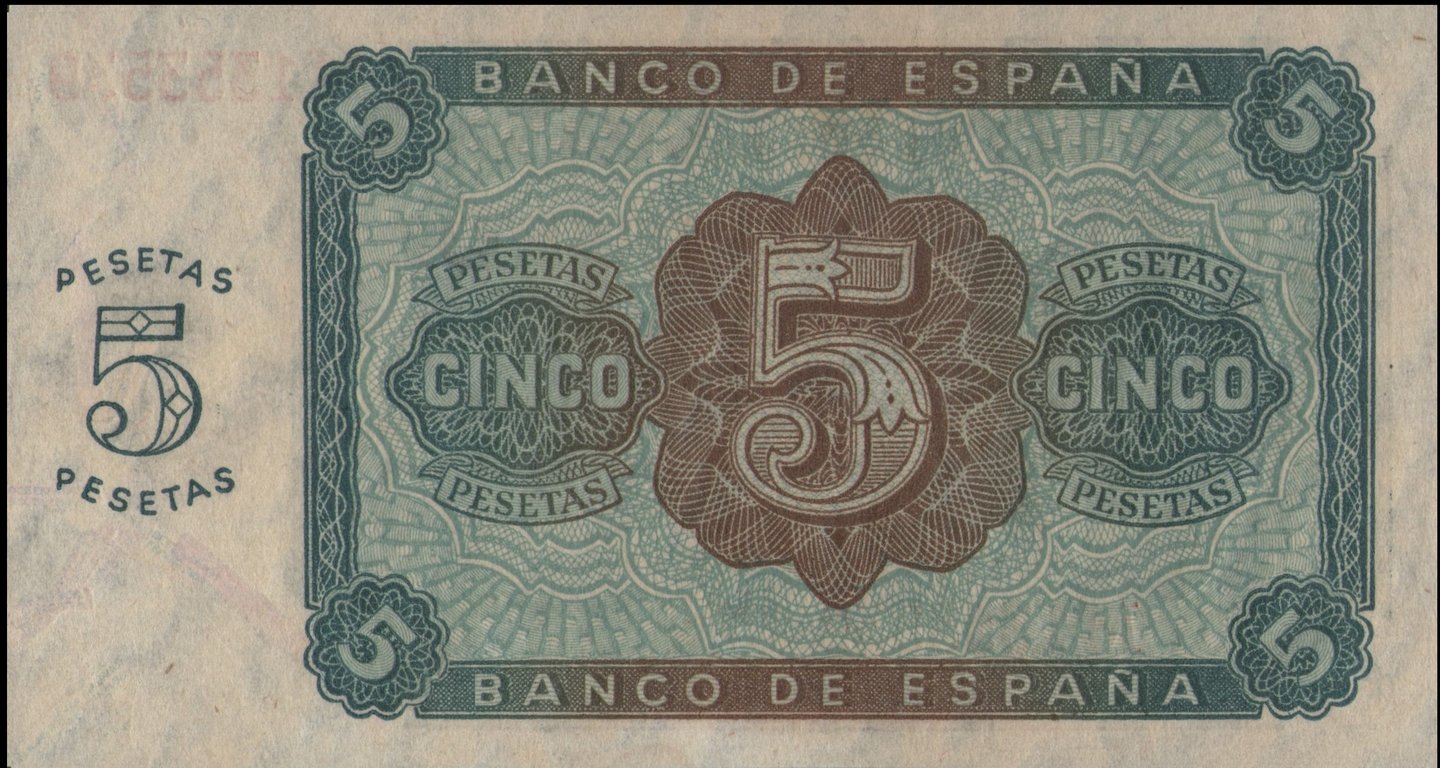 5 peseta, 10 de agosto de 1938. Burgos. Anverso, Banco de España, cifra del valor del billete. Reverso, Banco de España, cifra del valor del billete. Impreso en litografía y tipografía por Giesecke & Devrient Leipzig/Berlín.