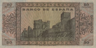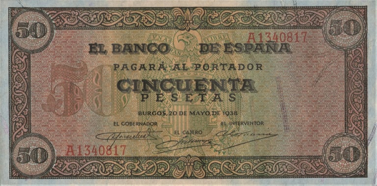 50 pesetas, 20 de mayo de 1938. Burgos. Anverso, escudo del estado español. Reverso, Castillo de Olite. Impreso en litografía y tipografía por Giesecke & Devrient Leipzig/Berlín. Tamaño: 149 x 75 mm. Tirada: 43.750.000. Circulación: A partir del 8 de febrero de 1939.