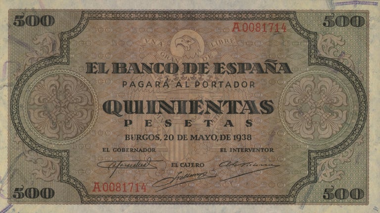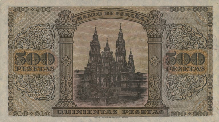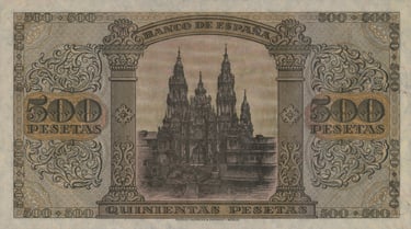 500 pesetas, 20 de mayo de 1938. Burgos. Anverso, escudo del estado español. Reverso, la Catedral de Santiago de Compostela. Impreso en litografía y tipografía por Giesecke & Devrient Leipzig/Berlín. Tamaño: 169 x 94 mm.