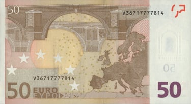 50 euro, 2002, Jean-Claude Trichet. Anverso, arco de arquitectura renacentista. Reverso, un mapa de Europa y un puente de arquitectura renacentista. Emisor, el Banco Central Europeo. Marca de agua: Arquitectura renacentista. Diseñado por Robert Kalina, del Banco Nacional de Austria. Tamaño: 140 x 74 mm.