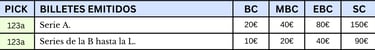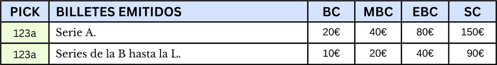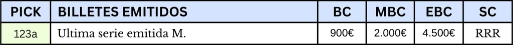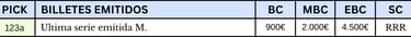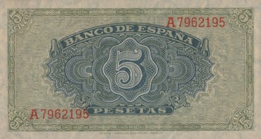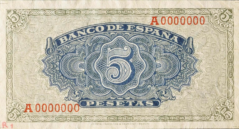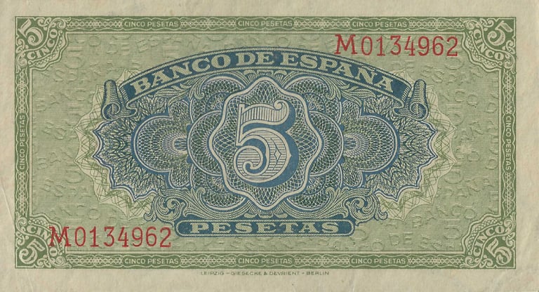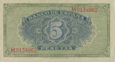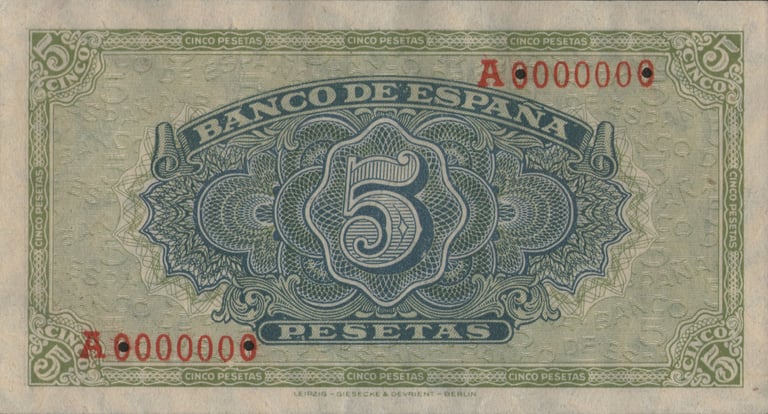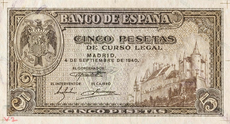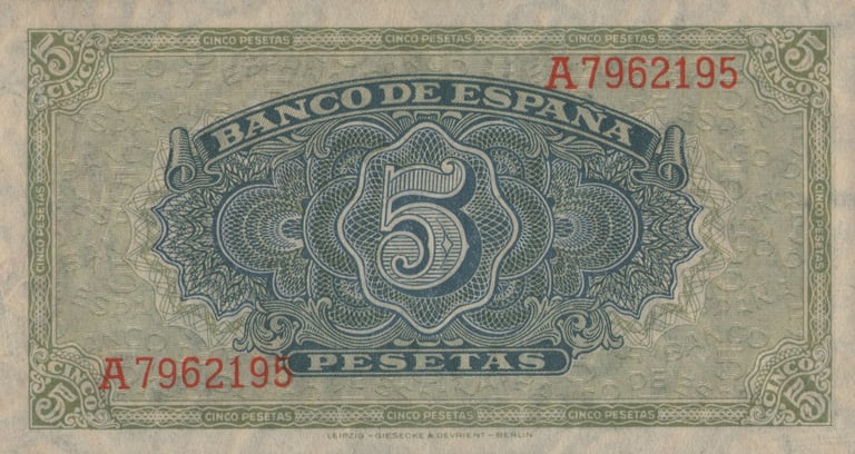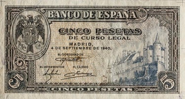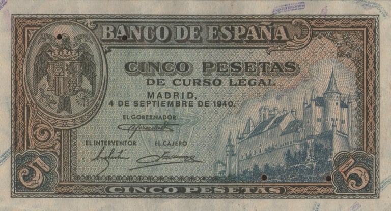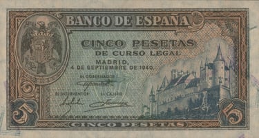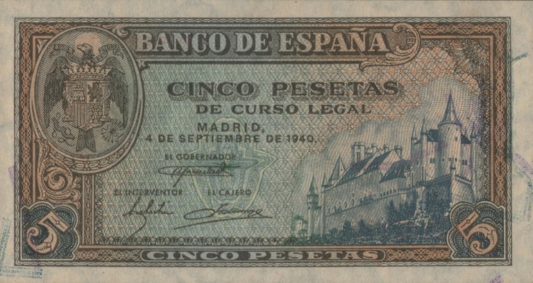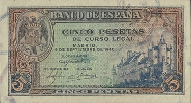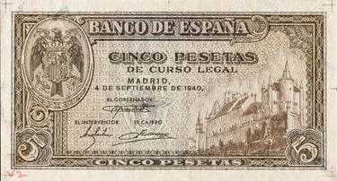 5 pesetas, 4 de septiembre de 1940. Anverso, vista del Alcázar de Segovia, escudo de España. Reverso, Greca con motivos geométricos y cifras del valor en el rosetón central. Impreso por Giesecke & Devrient, Leipzig, Berlín (Alemania). Impreso por procedimiento litográfico.