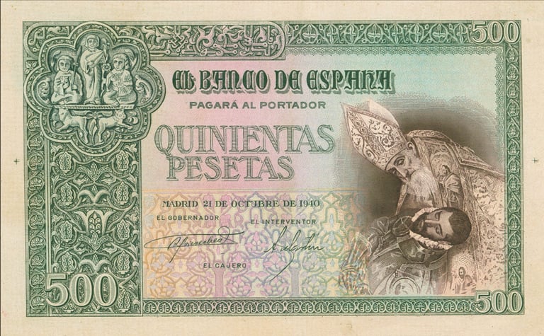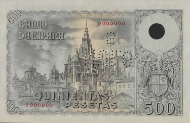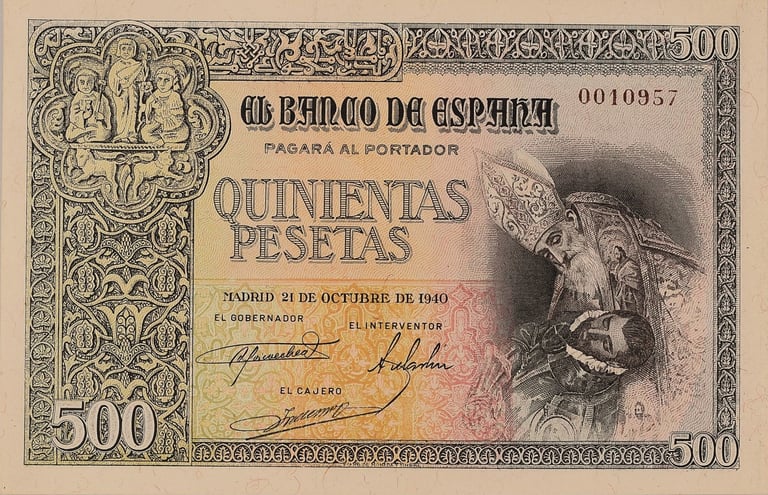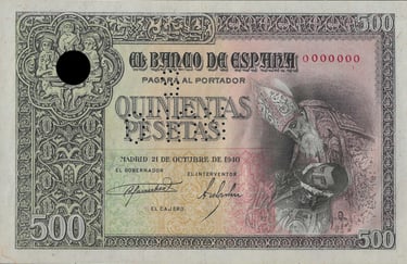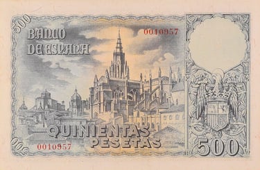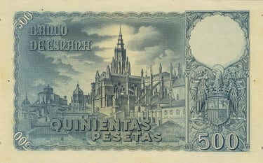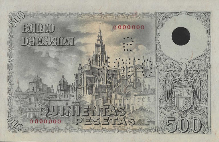 500 pesetas, 21 de octubre de 1940. Anverso, fragmento del cuadro, El entierro del Conde de Orgaz de El Greco [Iglesia de Santo Tomé, Toledo]; rosetón con la reproducción del Bote de Al-Muguira. Reverso, vista de Toledo con la Catedral; escudo de España. Grabado por José Luis L. Sánchez Toda y Alfonso L. Sánchez Toda.