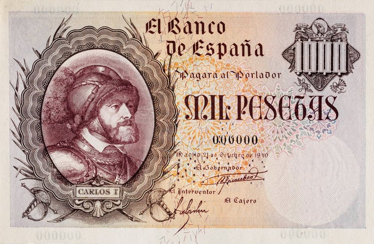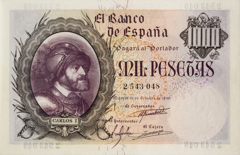 1000 pesetas, 21 de octubre de 1940. Anverso, retrato de Carlos I, rey de España en medallón, fragmento del cuadro El Emperador Carlos V a caballo en Mühlberg [Museo del Prado, Madrid]; sobre el escudo de España. Reverso, escudo de Carlos I y valor en cifras y en letras. Grabado por Camilo Delhom. Impreso en litografía por la Fábrica Nacional de Moneda y Timbre.