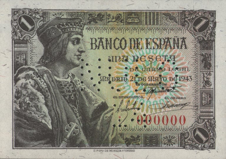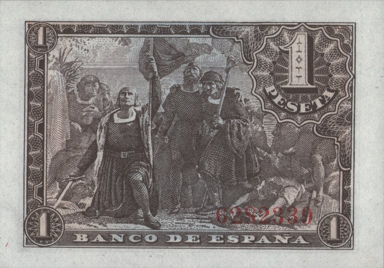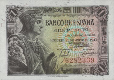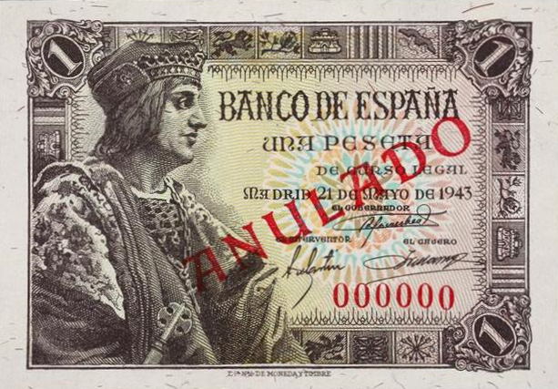 1 peseta, 21 de mayo de 1943. Anverso, busto de Fernando el Católico, orla con los distintos escudos de los reinos españoles y cifras del valor en los tres ángulos. Reverso, fragmento del cuadro de Dióscoro Teófilo de la Puebla, primer desembarco de Cristóbal Colón en América. Diseñado por Camilo Delhom.
