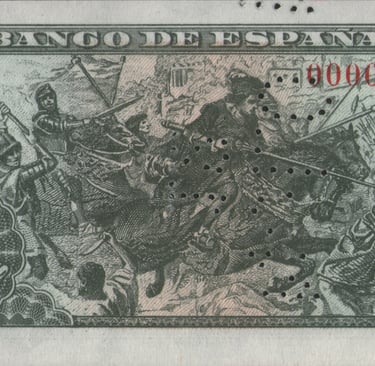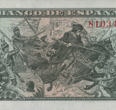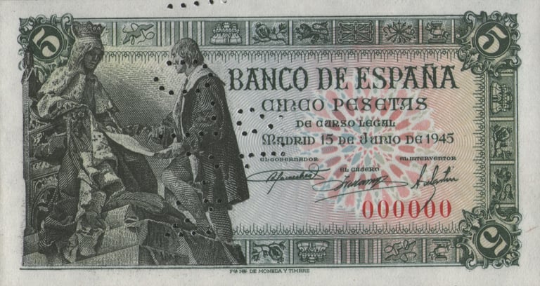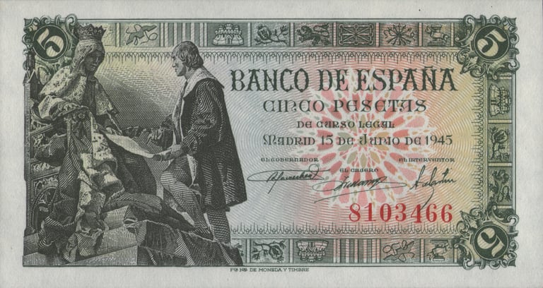 5 pesetas, 15 de junio de 1945. Anverso, representación de las Capitulaciones de Santa Fe, inspirado en el monumento realizado por Mariano Benlliure [Plaza de Isabel la Católica, de Granada]. Reverso, Escena del Gran Capitán en las guerras de Granada y cifras del valor en los ángulos. Grabado por José Luis L. Sánchez Toda (anverso) Alfonso L. Sánchez Toda (reverso).