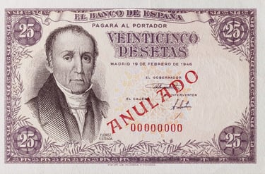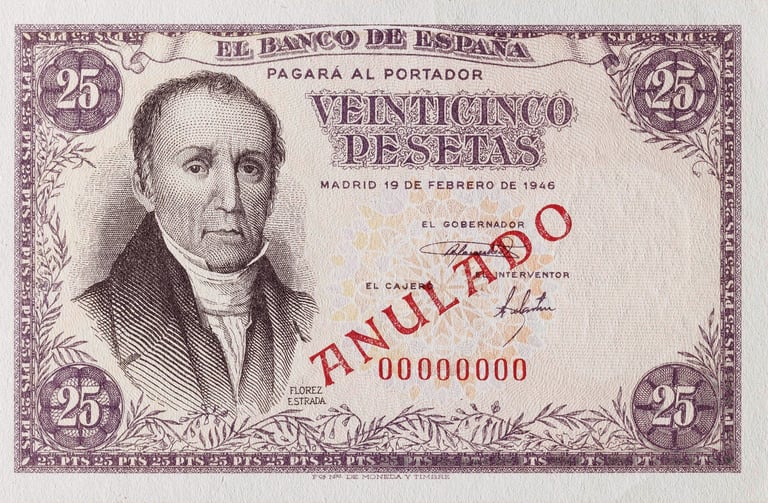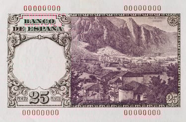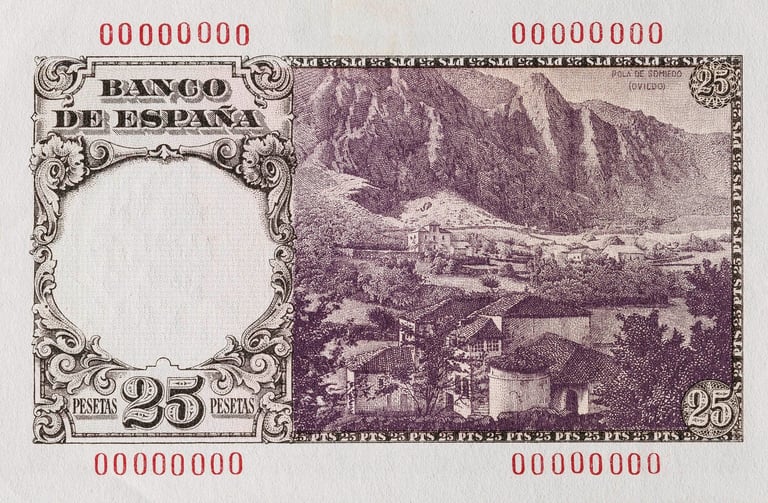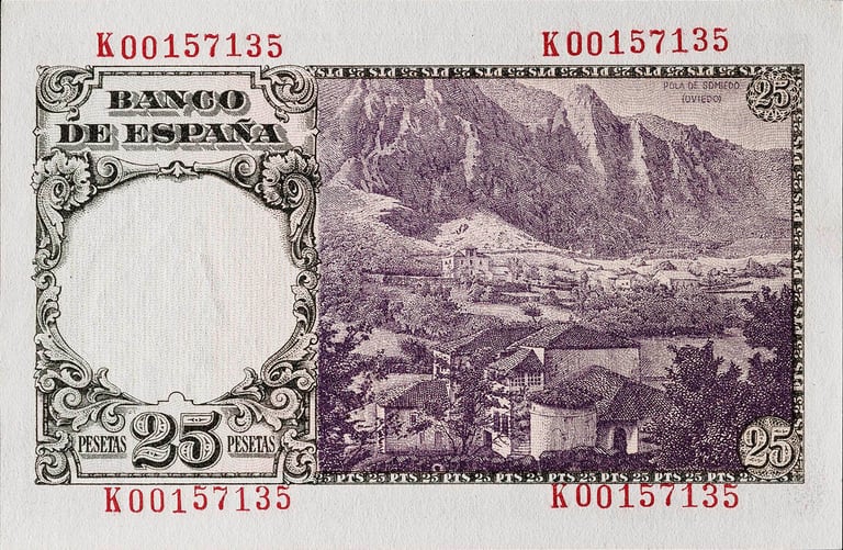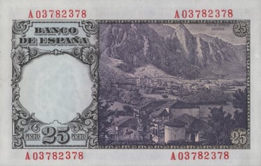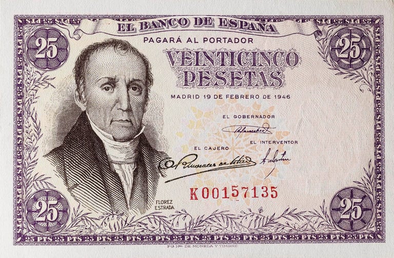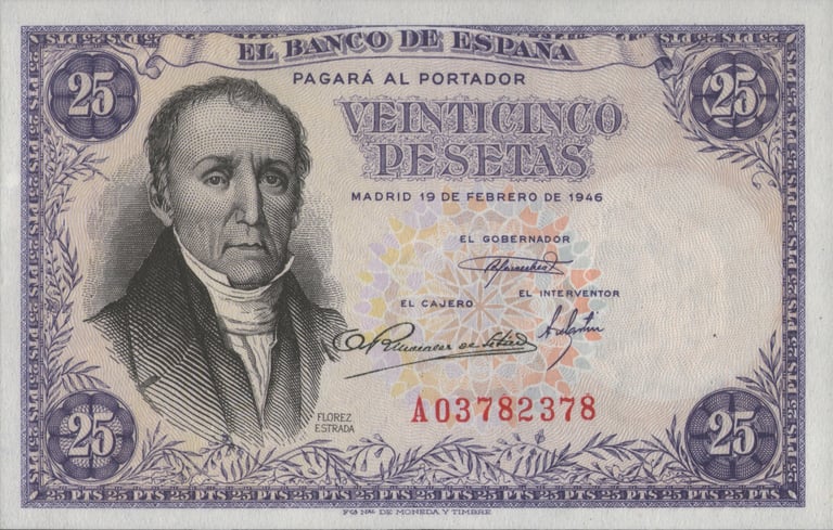 25 pesetas, 19 de febrero de 1946. Anverso, retrato de Álvaro Flórez Estrada, economista español y cifras del valor en los ángulos y en la orla. Reverso, vista de Pola de Somiedo (Asturias). Grabado por José Luis L. Sánchez Toda (anverso) Alfonso L. Sánchez Toda (reverso). Marca de agua: Cabeza romana de perfil.