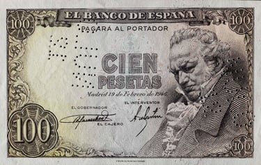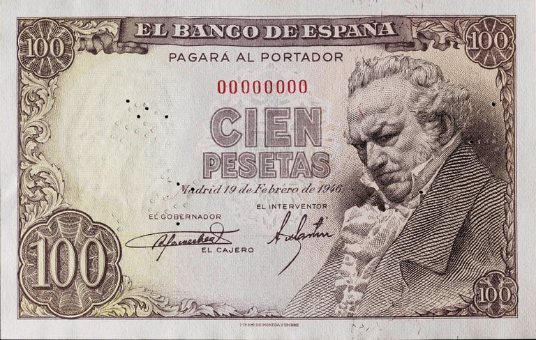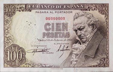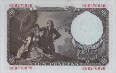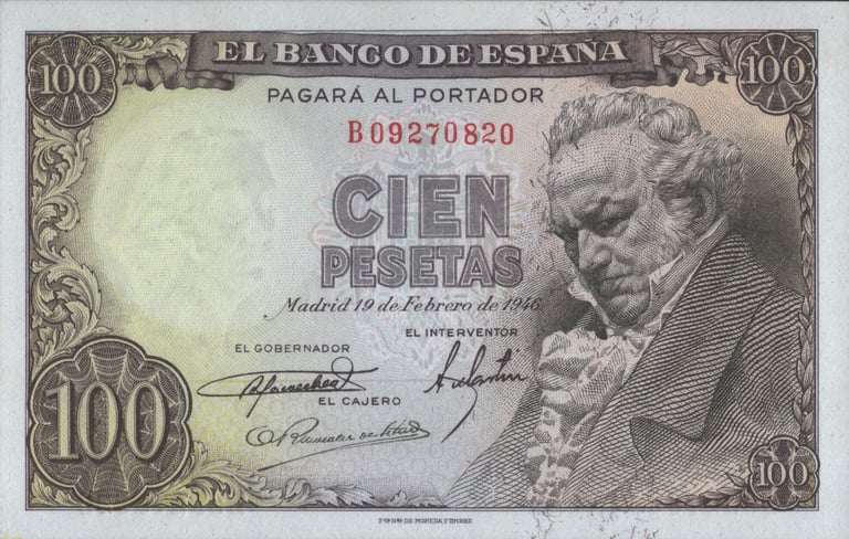 100 pesetas, 19 de febrero de 1946. Anverso, retrato de Francisco de Goya, basado en una escultura de Mariano Benlliure; escudo de España. Reverso, cartón de Goya para el tapiz El Quitasol, [Museo del Prado, Madrid]. Grabado por José Luis L. Sánchez Toda. Marca de agua: Cabeza de Goya.