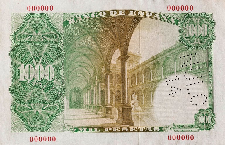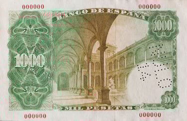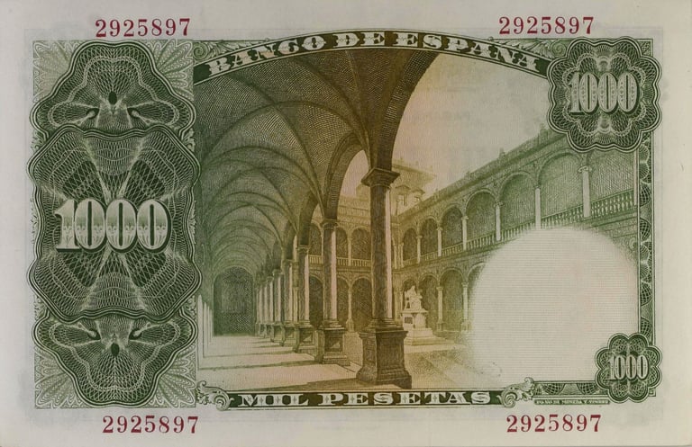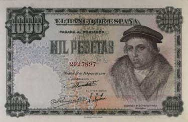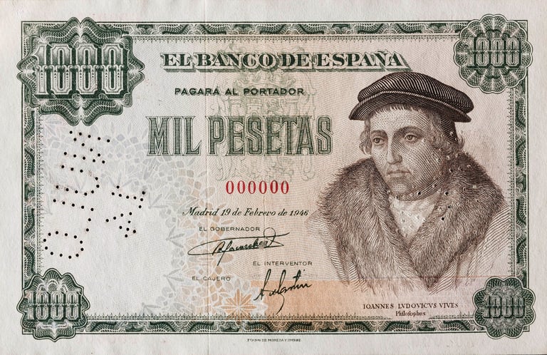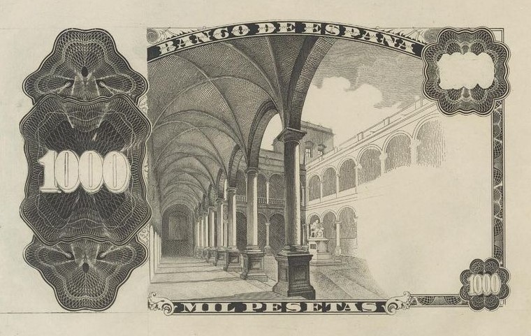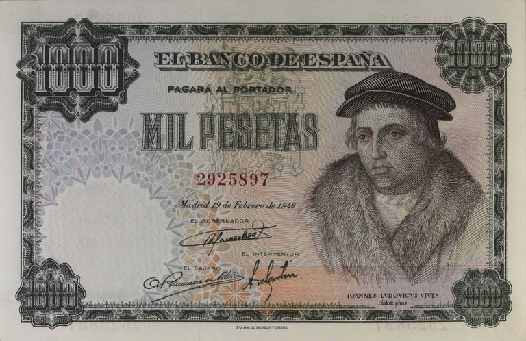 1000 pesetas, 19 de febrero de 1946. Anverso, Juan Luis Vives, escudo de España. Reverso, Claustro del Colegio del Patriarca, Valencia y cifras del valor. Grabado por José Luis L. Sánchez-Toda (anverso, firmado en plancha) y Alfonso L. Sánchez-Toda (reverso).