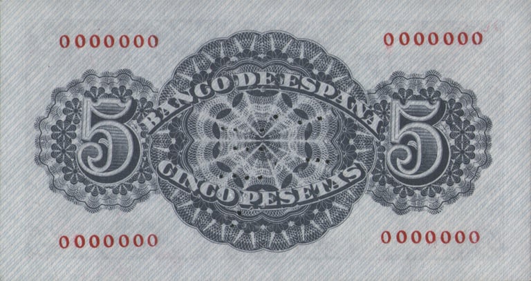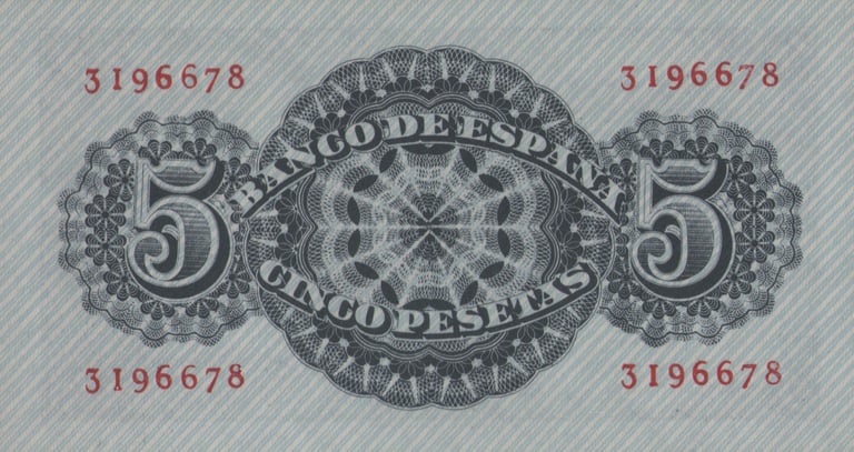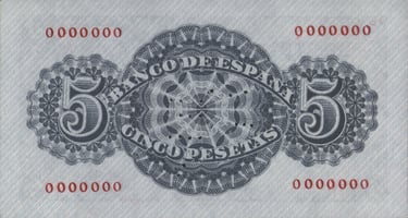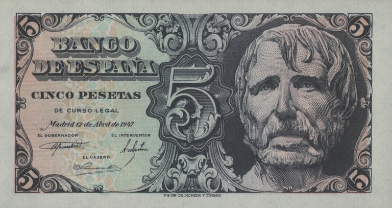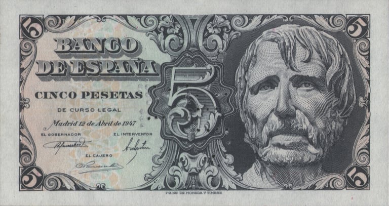 5 pesetas, 12 de abril de 1947. Anverso, cabeza de Lucio Anneo Séneca, en medallón y cifras del valor en rosetón central y en los ángulos. Reverso, cifras del valor en rosetones laterales y en letras en rosetón central. Grabado por José Luis L. Sánchez Toda.