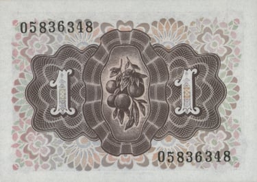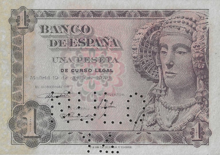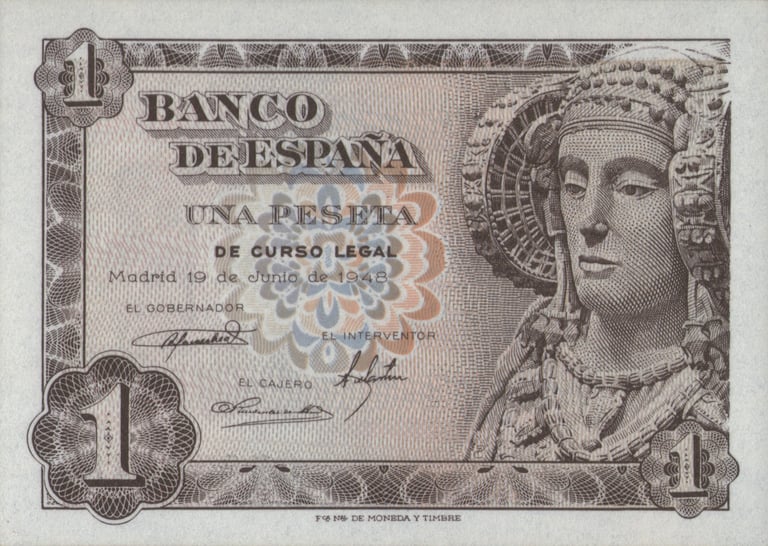 1 peseta, 19 de junio de 1948. Anverso, la Dama de Elche, siglos V y IV a. C. Reverso, ramas de naranjo y cifras del valor a ambos lados. Grabado por José Luis L. Sánchez Toda, y Alfonso L. Sánchez Toda.