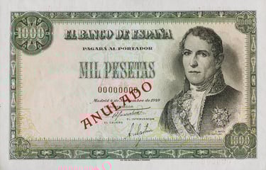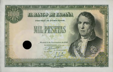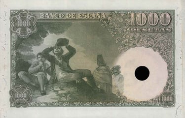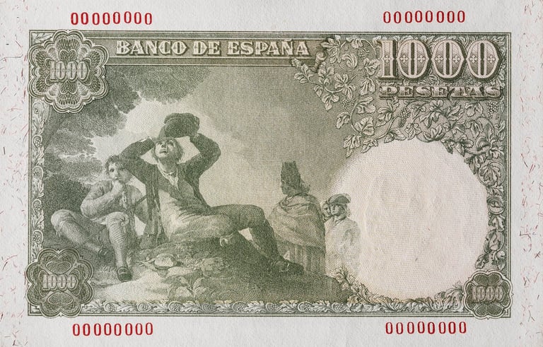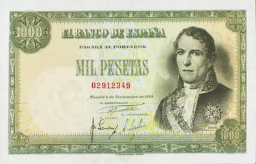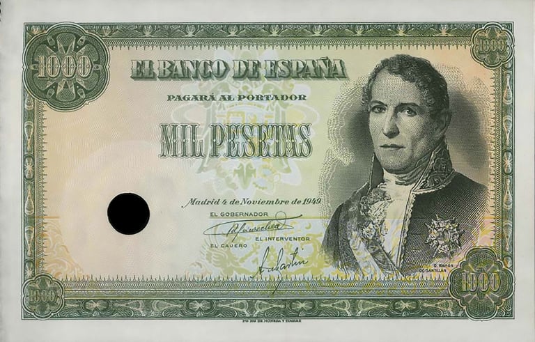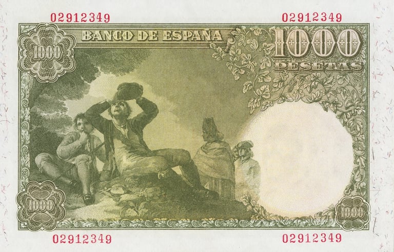 1000 pesetas, 4 de noviembre de 1949. Anverso, Ramón Santillán, Gobernador del Banco de España, fragmento del cuadro de José Gutiérrez de la Vega, escudo de España. Reverso, obra de Goya, El bebedor [Museo del Prado, Madrid]. Grabado por José Luis L. Sánchez Toda, (anverso y reverso) y Alfonso L. Sánchez Toda, (reverso). Marca de agua: Cabeza de Goya.