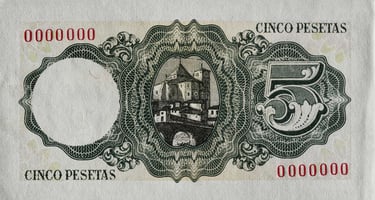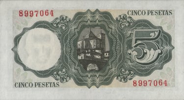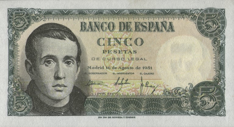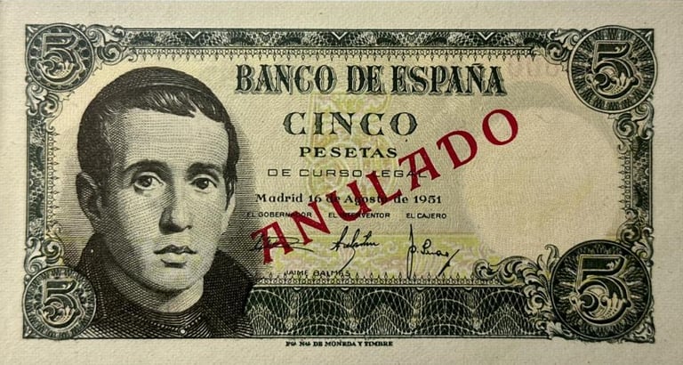 5 pesetas, 16 de agosto de 1951. Anverso, retrato de Jaime Balmes. Reverso, vista de la ciudad de Vich con la catedral al fondo, en óvalo y valor en cifras en rosetón a la derecha. Grabado por José Luis L. Sánchez Toda, (anverso) y Alfonso L. Sánchez Toda, (reverso).