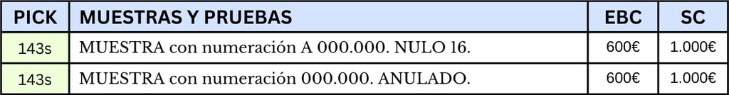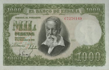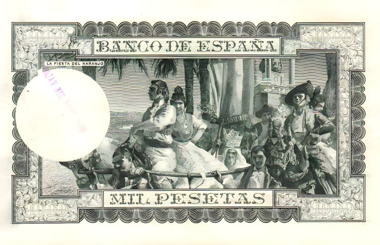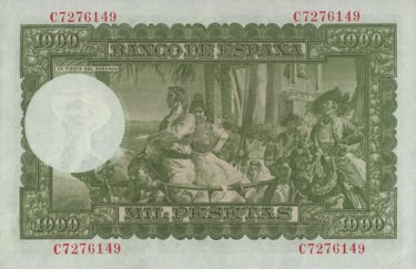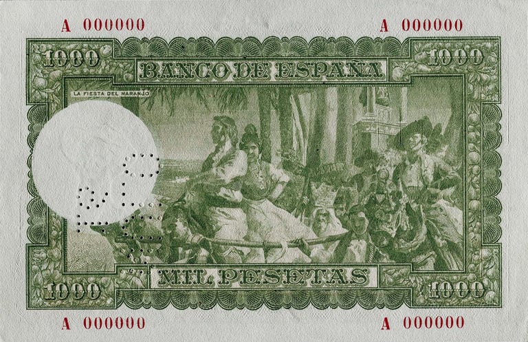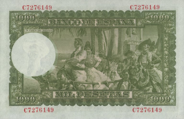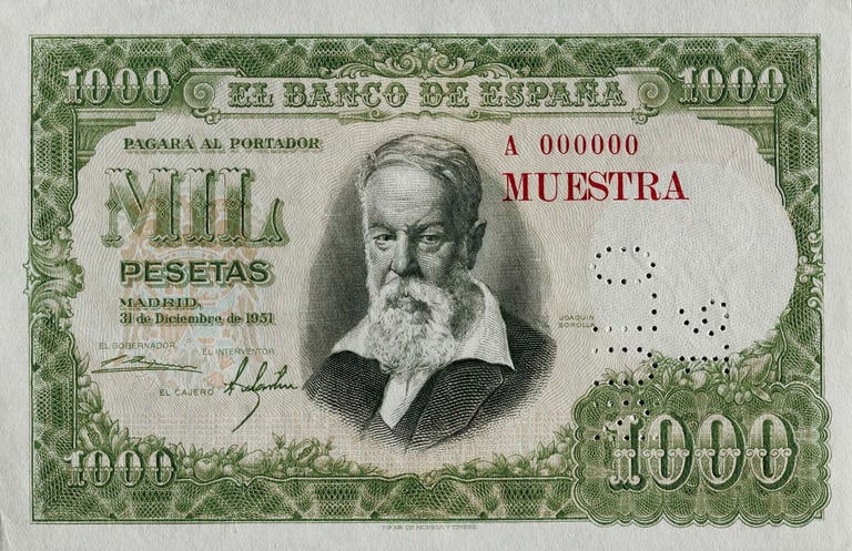 1000 pesetas, 31 de diciembre de 1951. Anverso, Joaquín Sorolla, escudo de España a la izquierda. Reverso, Cuadro de Sorolla, La fiesta del naranjo. Grabado por Camilo Delhom (anverso y reverso) y José Luis L. Sánchez Toda. Marca de agua: Cabeza de don Quijote.