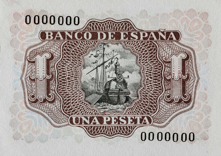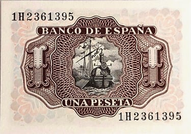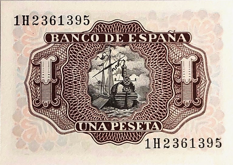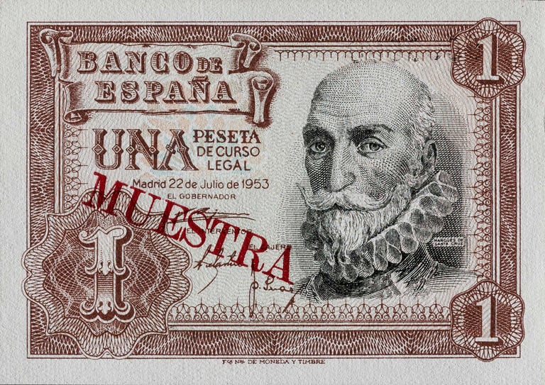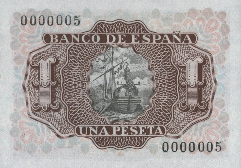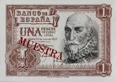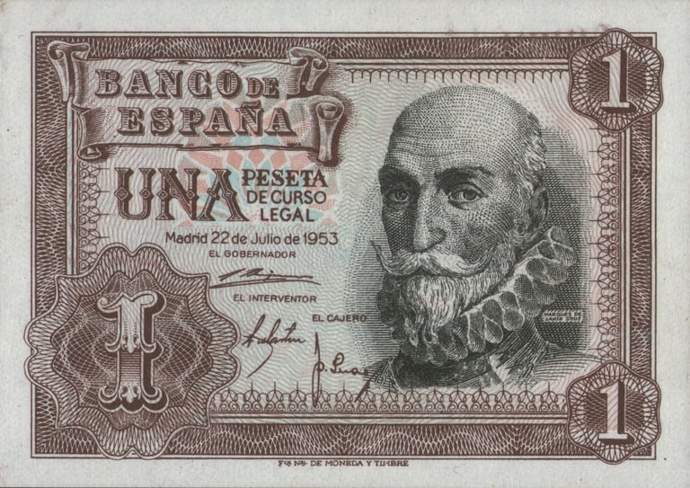 1 peseta, 22 de julio de 1953. Anverso, retrato de [Álvaro de Bazán], Marqués de Santa Cruz, almirante español. Reverso, Galeón en rosetón de dibujos geométricos y cifras del valor a ambos lados. Grabado por Alfonso L. Sánchez Toda.