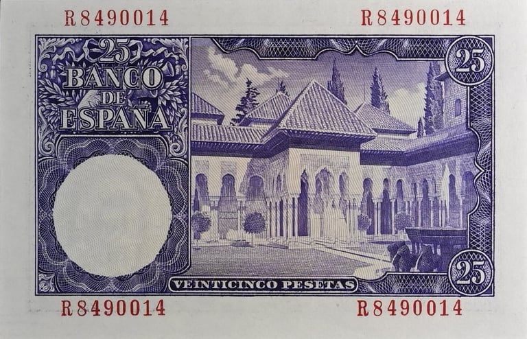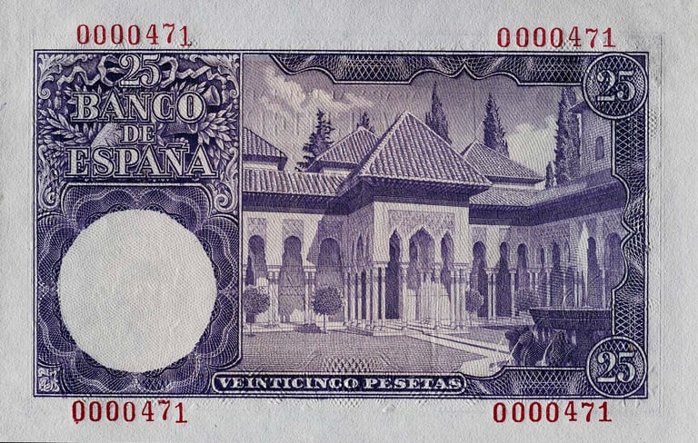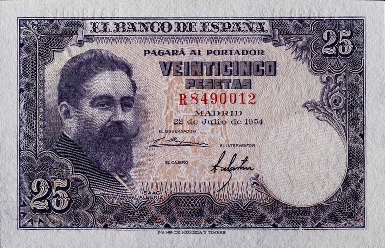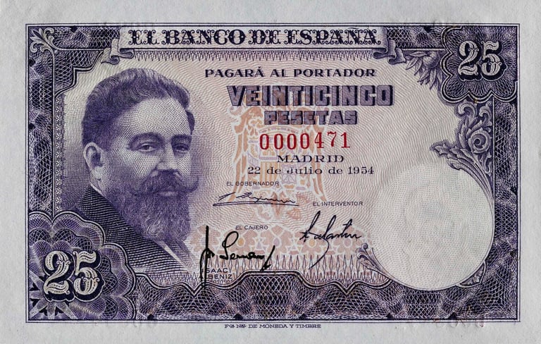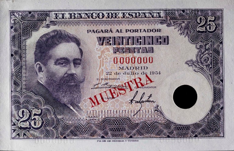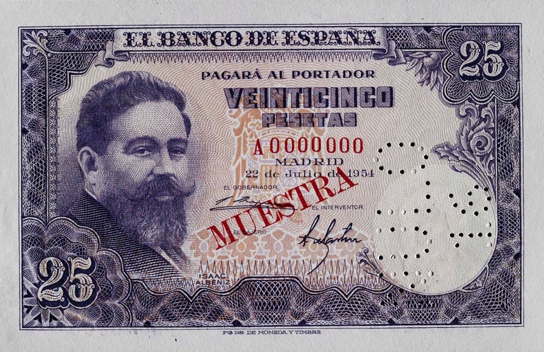25 pesetas, 22 de julio de 1954. Anverso, Isaac Albéniz, escudo de España. Reverso, Patio de los Leones, de la Alhambra, Granada. Grabado por José López Pavía (anverso) y José Luis L. Sánchez Toda (reverso). Marca de agua: Cabeza de Isaac Albéniz.