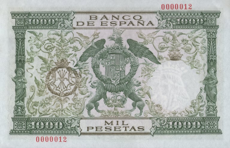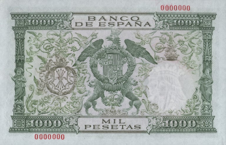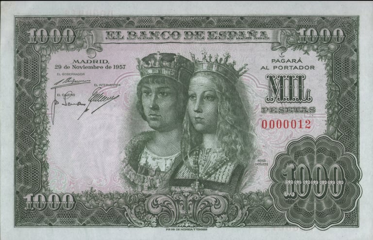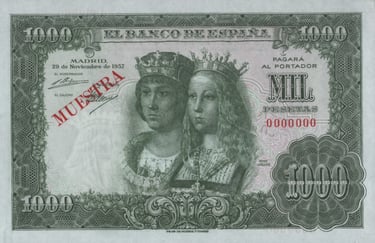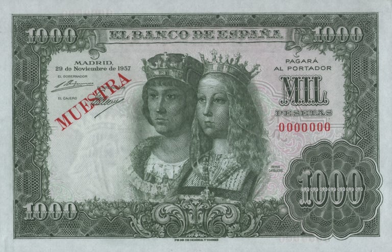 1000 pesetas, 29 de noviembre de 1957. Anverso, Reyes Católicos según el cuadro de Juan Antonio Morales. Reverso, reproducción de la parte central de la reja de la capilla de los R. Católicos en la Catedral de Granada. Grabado por José Luis L. Sánchez Toda y Alfonso L. Sánchez Toda. Marca de agua: Reyes Católicos.