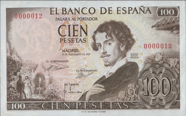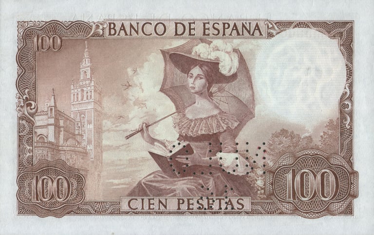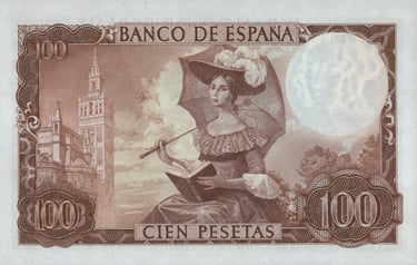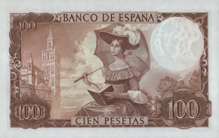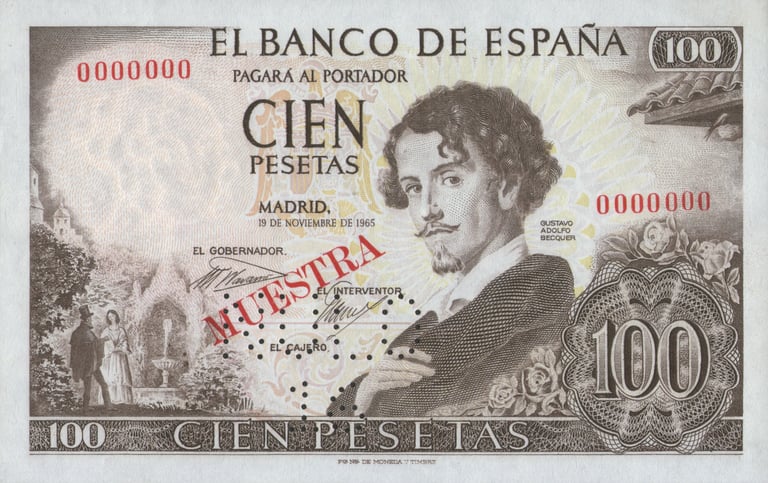 100 pesetas, 19 de noviembre de 1965. Anverso, Gustavo Adolfo Bécquer, escudo de España, escenificación de una de sus rimas. Reverso, dama romántica; vista de la catedral de Sevilla con la Giralda. Grabado por Alfonso L. Sánchez Toda y José Luis L. Sánchez Toda.