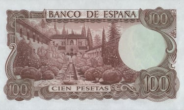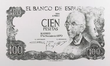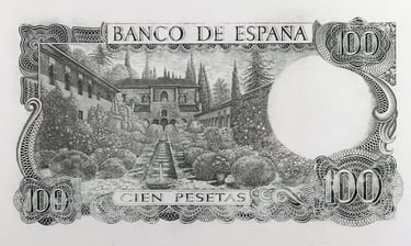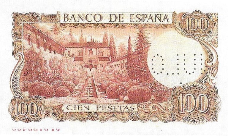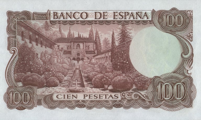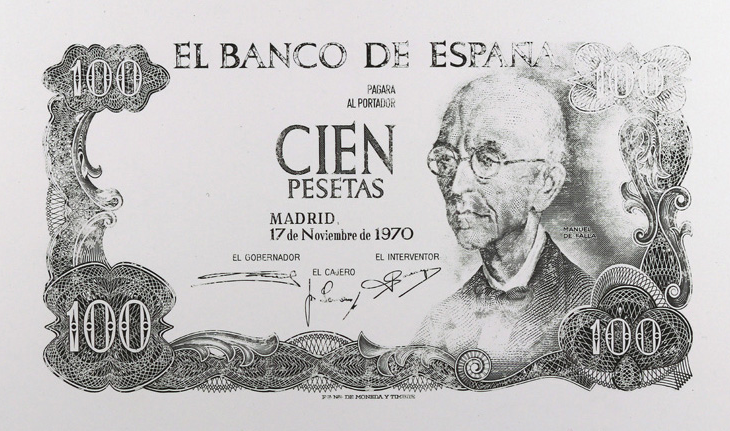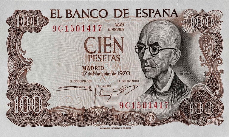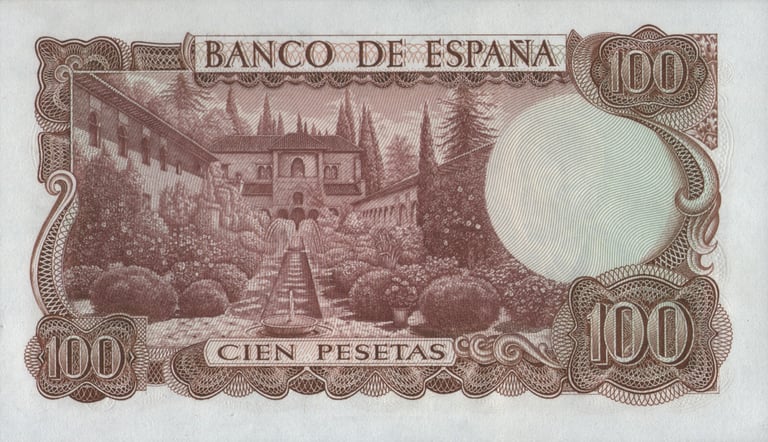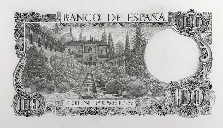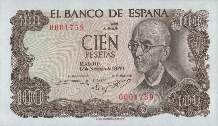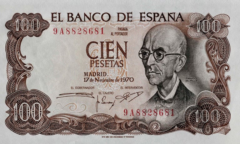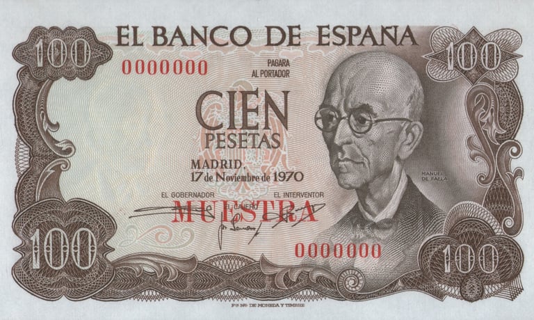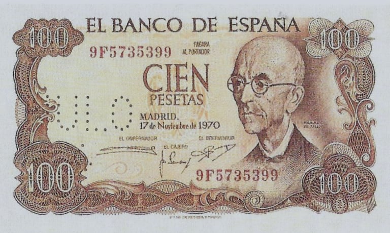 100 pesetas, 19 de noviembre de 1970. Anverso, Manuel de Falla, escudo de España. Reverso, vista del Patio de los Surtidores, del Generalife, Granada. Grabado por Antonio Manso Fernández y Daniel Carande. Marca de agua: Manuel de Falla.