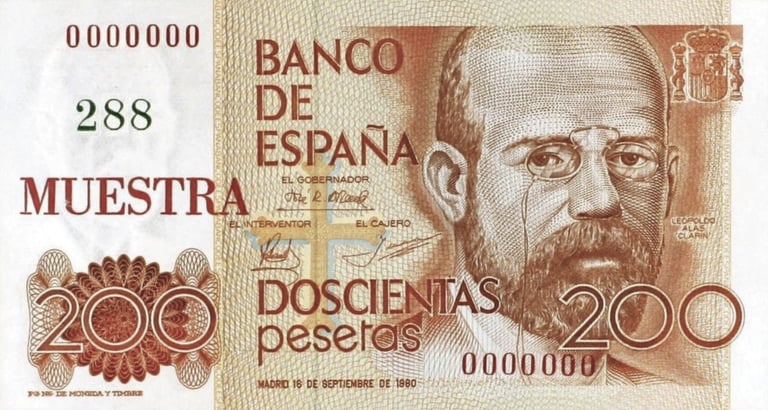 200 pesetas, 16 de septiembre de 1980. Anverso, Leopoldo Enrique García-Alas y Ureña. Reverso, El carbayón, cruz de la Victoria de Oviedo. Grabado por José Manuel Mata Martin y Antonio Sánchez Gutiérrez. Marca de agua: Cabeza de «Clarín». Impreso en calcografía y litografía por la Fábrica Nacional de Moneda y Timbre. Tamaño: 120 x 65 mm.