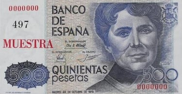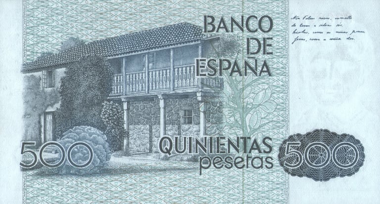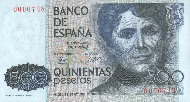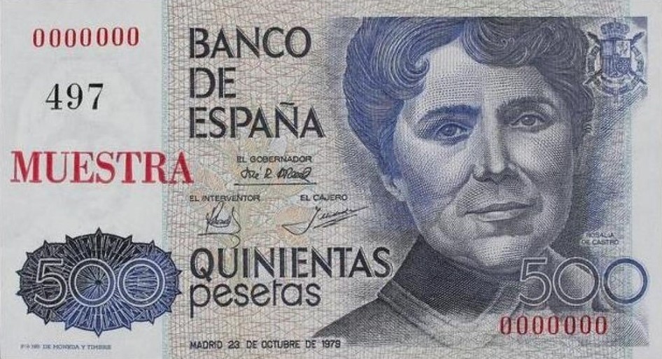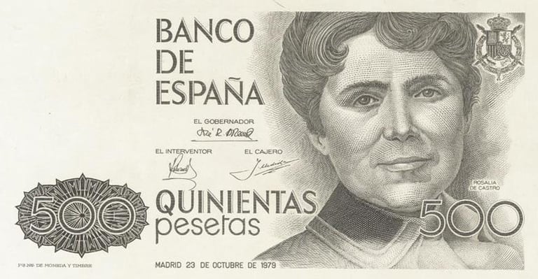 500 pesetas, 23 de octubre de 1979. Anverso, Rosalía de Castro. Reverso, Casa Museo de Rosalía de Castro, en Padrón. Grabado por Pablo Sampedro Molero y Antonio Sánchez Gutiérrez. Marca de agua: Cabeza de Rosalía de Castro. Impreso en calcografía y litografía por la Fábrica Nacional de Moneda y Timbre. Tamaño: 129 x 70 mm.