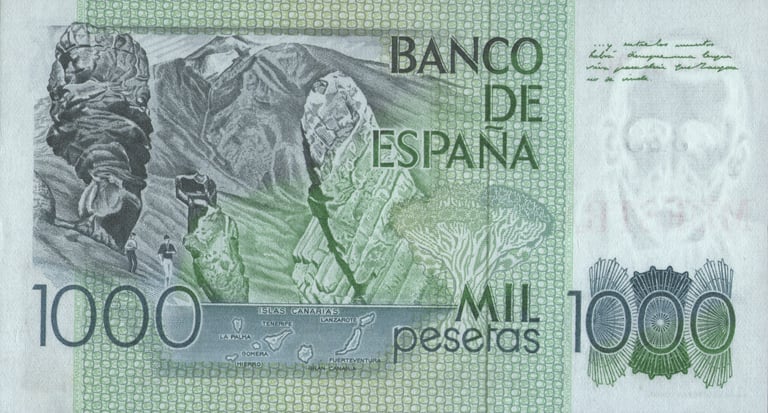 1000 pesetas, 23 de octubre de 1979. Anverso, Benito Pérez Galdós. Reverso, Volcán el Teide, Drago Milenario de Icod de los Vinos. Grabado por Pablo Sampedro Molero y Antonino Sánchez Gutiérrez. Marca de agua: Benito Pérez Galdós. Impreso en calcografía y litografía por la Fábrica Nacional de Moneda y Timbre. Tamaño: 138 x 77 mm.