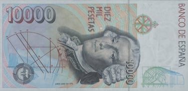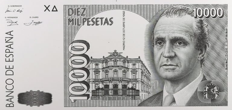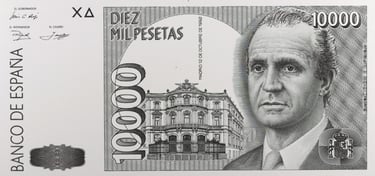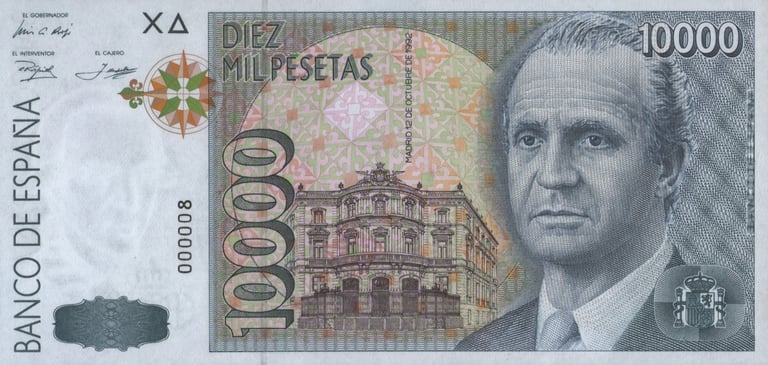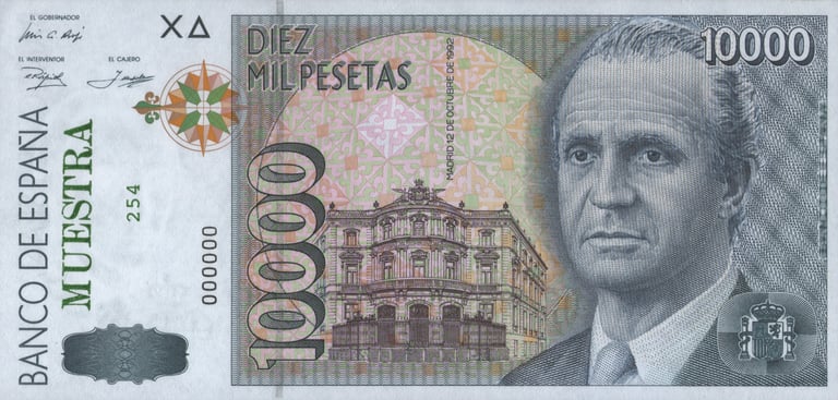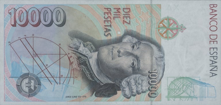 10000 pesetas, 12 de octubre de 1992. Anverso, Rey Juan Carlos I, vista de la Casa de América, Madrid. Reverso, en vertical, retrato de Jorge Juan. Grabado por José López Pavía. Marca de agua: Retrato de Antonio de Ulloa y de la Torre Guiral. Impreso en calcografía y litografía por la Fábrica Nacional de Moneda y Timbre. Tamaño: 155 x 74 mm.