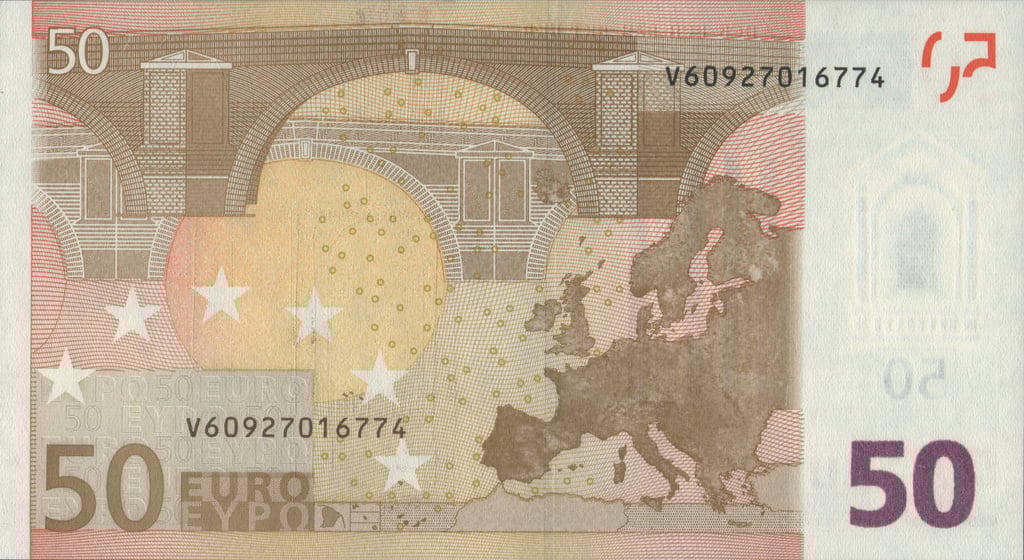 50 euro, 2002, Mario Draghi. Anverso, arco de arquitectura renacentista. Reverso, un mapa de Europa y un puente de arquitectura renacentista.