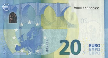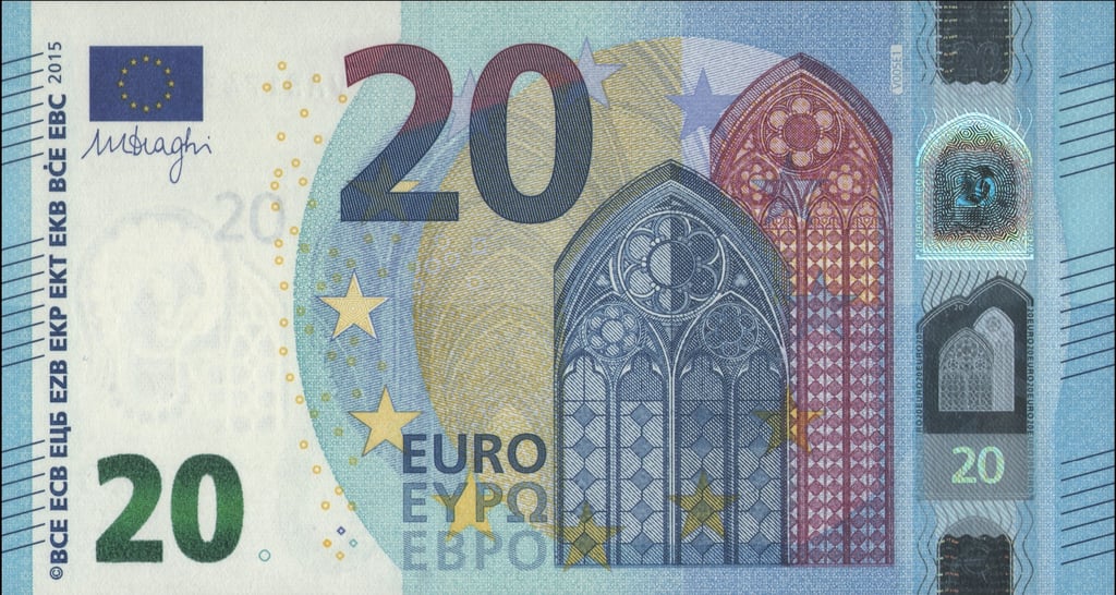 20 euro, 2015, Mario Draghi. Anverso, arco de arquitectura clásica. Reverso, un mapa de Europa y un puente de la era clásica. Emisor, el Banco Central Europeo. Marca de agua: Personaje de la mitología griega. Diseñado por Reinhold Gerstetter. Tamaño: 133 x 72 mm.