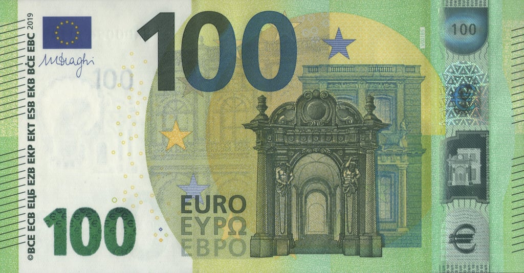 100 euro, 2019, Mario Draghi. Anverso, arco de arquitectura barroca y rococó. Reverso, un mapa de Europa y un puente arquitectura barroca y rococó. Emisor, el Banco Central Europeo. Marca de agua: Personaje de la mitología griega. Diseñado por Reinhold Gerstetter. Tamaño: 147 x 77 mm.