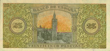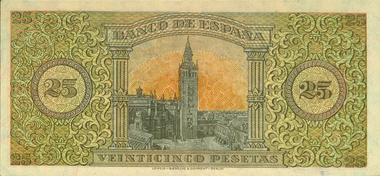 Anverso, escudo del estado español. Reverso, Giralda de Sevilla. Impreso en litografía y tipografía por Giesecke & Devrient Leipzig/Berlín.