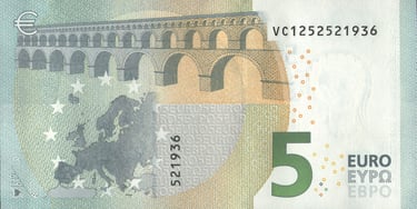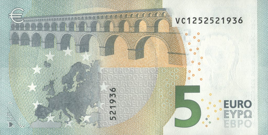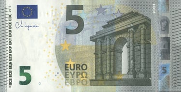 5 euro, 2013, Christine Madeleine Odette Lagarde. Anverso, arco de arquitectura clásica. Reverso, un mapa de Europa y un puente de la era clásica. Emisor, el Banco Central Europeo. Marca de agua: Personaje de la mitología griega.