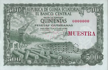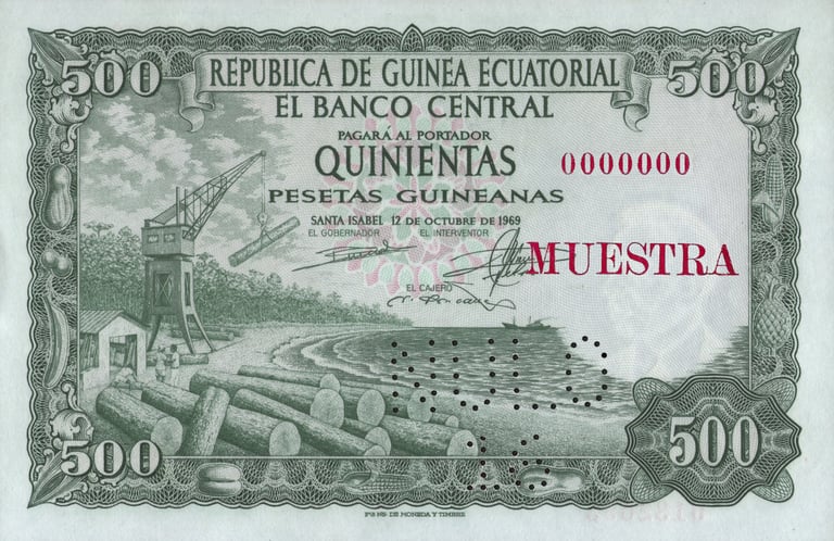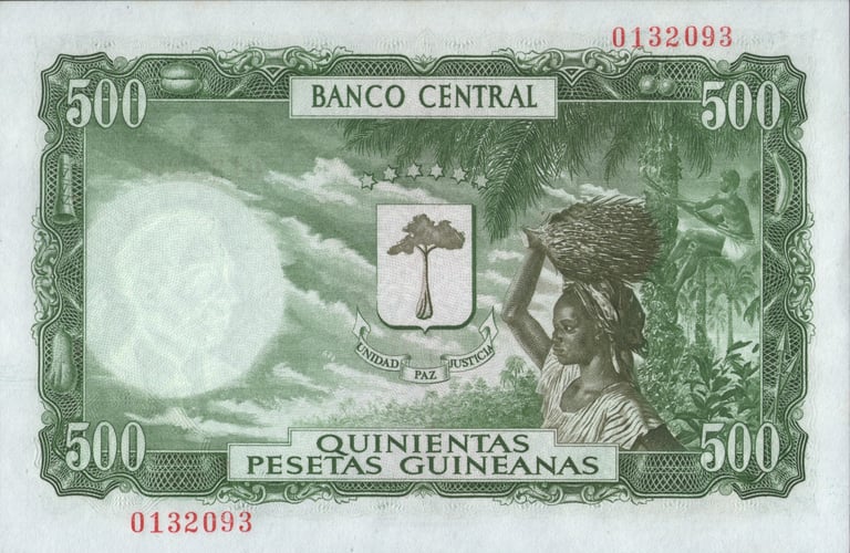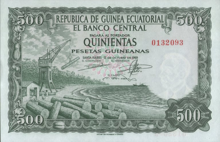 500 pesetas, Santa Isabel, 12 de octubre 1969. Anverso, escenas de transporte, carga y tala de troncos a la orilla del mar. Reverso, mujer portando frutas, hombre recolectando fruta en una palmera, escudo de armas de Guinea Ecuatorial libre. Unidad, Paz y Justicia.