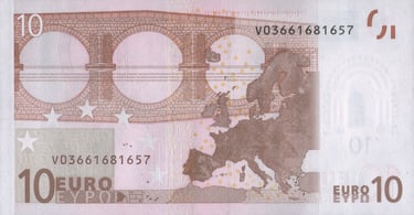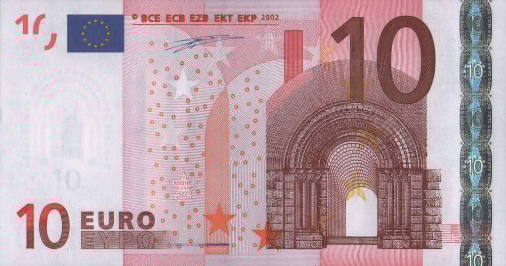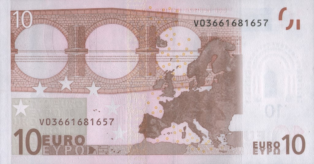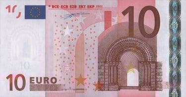 10 euro, 2002, Willem Frederik Duisenberg. Anverso, arco de arquitectura románica. Reverso, un mapa de Europa y un puente de la era románica. Emisor, el Banco Central Europeo. Marca de agua: Arquitectura románica. Diseñado por Robert Kalina, del Banco Nacional de Austria.