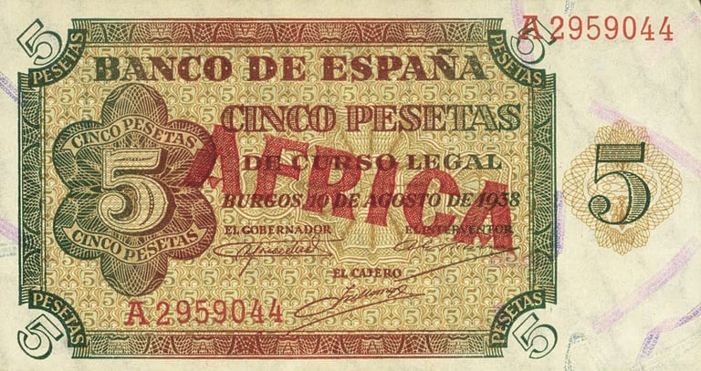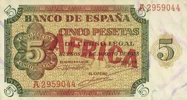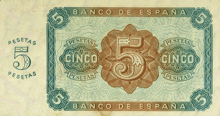5 peseta, 10 de agosto de 1938. Burgos. Anverso, Banco de España, cifra del valor del billete. Reverso, Banco de España, cifra del valor del billete.