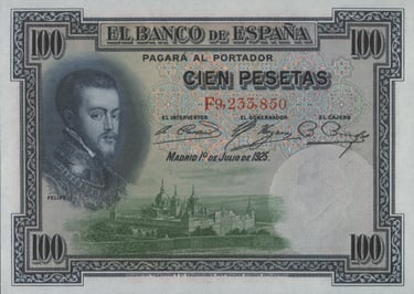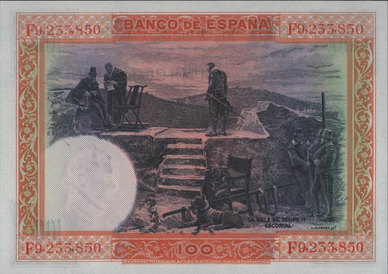 100 pesetas, 1 de julio de 1925. Anverso, retrato de Felipe II, según Tiziano, y monasterio de San Lorenzo de El Escorial. Reverso, “La silla de Felipe II” cuadro del pintor L. Álvarez. Impreso en calcografía y litografía por Bradbury. Marca de agua, cabeza de Felipe II. Tamaño: 140 x 100 mm. Tirada: 28.000.000. Circulación posterior al 18 de julio de 1936. Anteriormente habían circulado hasta el número D.2.000.000.