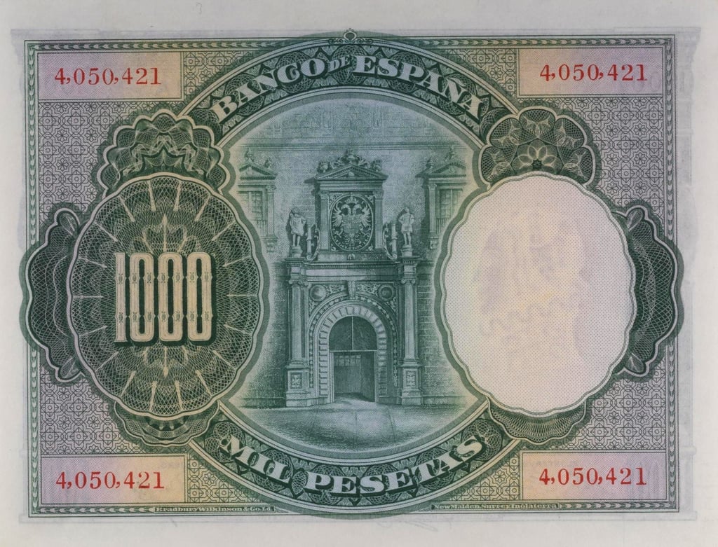 1000 pesetas, 1 de julio de 1925. Anverso, retrato de Carlos I, según Tiziano. Reverso, portada del Alcázar de Toledo. Impreso en calcografía y litografía por Bradbury Wilkinson and Company. Marca de agua: Cabeza de la emperatriz Isabel de Portugal.