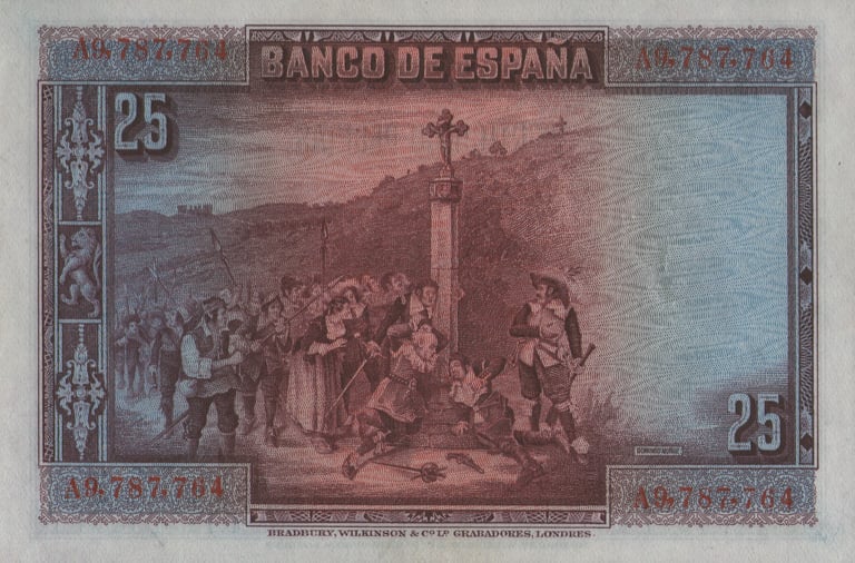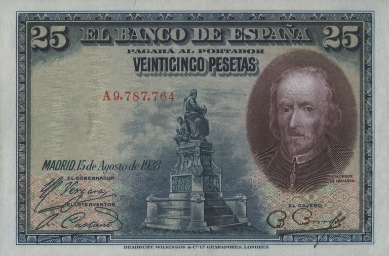 25 pesetas, 15 de agosto 1928. Anverso, Calderón de la Barca y monumento de la Plaza de Santa Ana de Madrid. Reverso, escena de la comedia “La devoción de la Cruz”. Impreso en calcografía y litografía por Bradbury Wilkinson and Company. Marca de agua: Cabeza femenina clásica. Tamaño: 112 x 72 mm. Tirada: 52.220.000. Circulación posterior al 18 de julio de 1936. Anteriormente habían circulado hasta el número A 7.780.000.