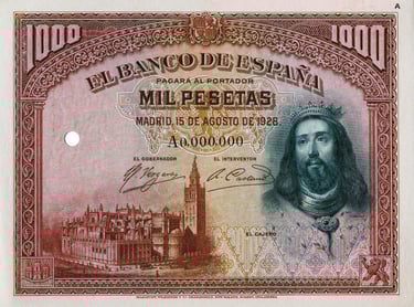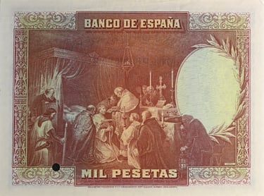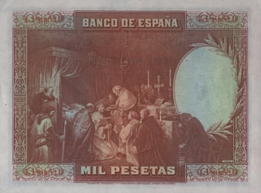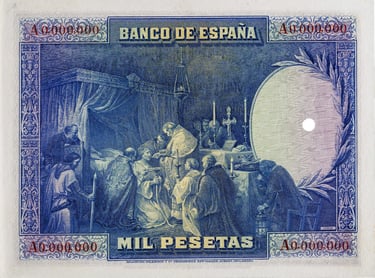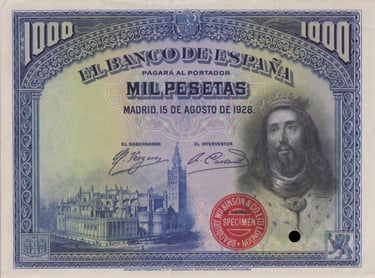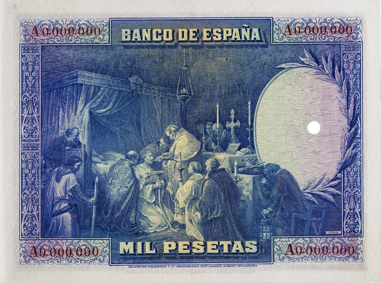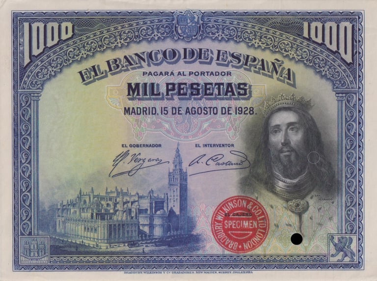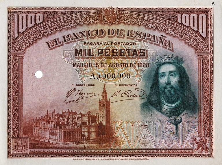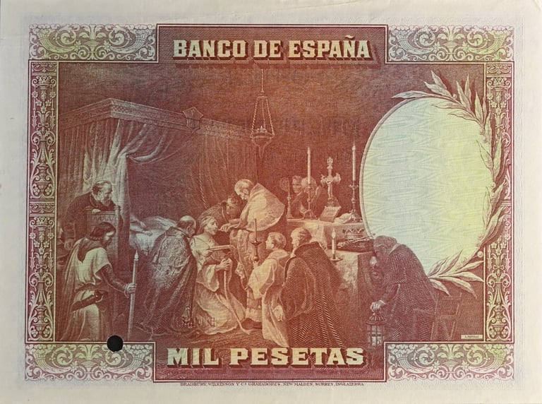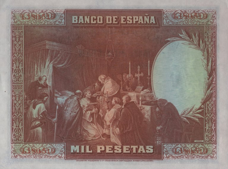 1000 pesetas, 15 de agosto 1928. Anverso, cabeza de Fernando III el Santo y catedral de Sevilla. Reverso, cuadro de Alejandro Ferrant y Fischermans, con el Rey tomando la sagrada comunión. Impreso en calcografía y litografía por Bradbury Wilkinson and Company.