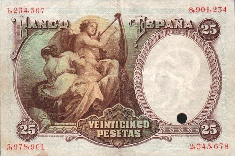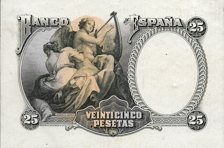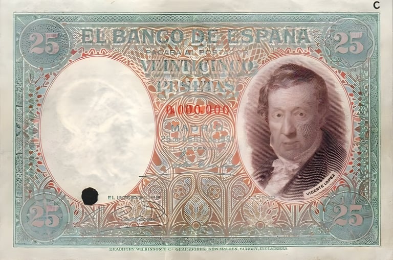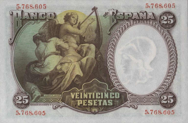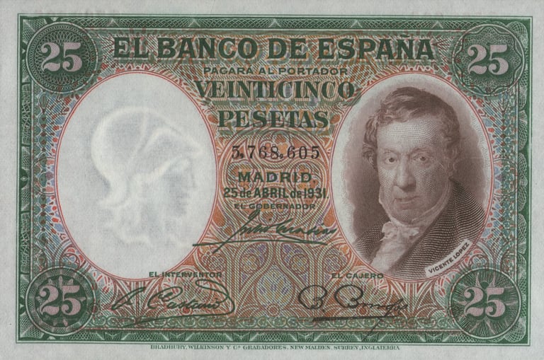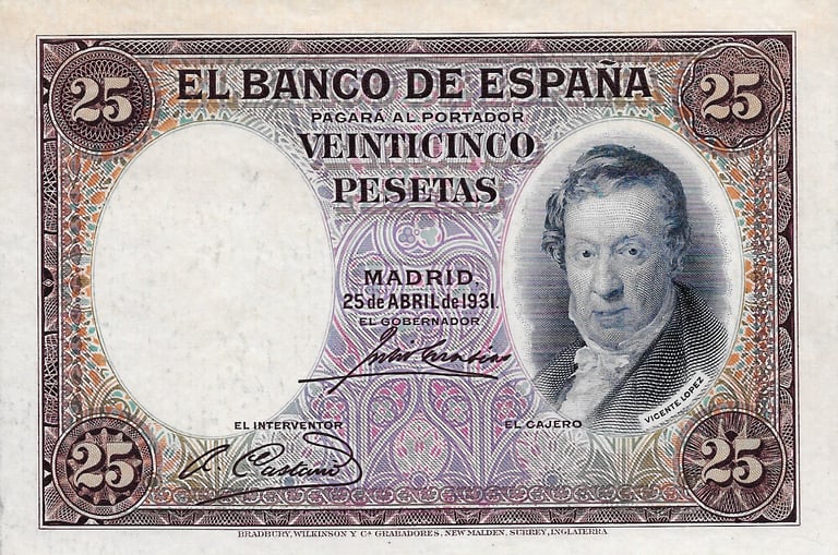 25 pesetas, 25 de abril de 1931. Anverso, autorretrato de Vicente López. Reverso, pintura representando la musica del mismo autor. Impreso en calcografía y litografía por Bradbury Wilkinson and Company. Marca de agua: Cabeza clasica con yelmo. Tamaño: 120 x 79 mm. Tirada: 10.000.000. Circulación: 15 de febrero 1937.