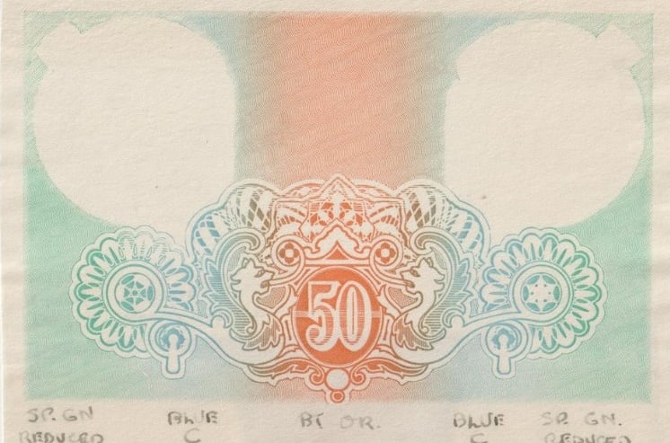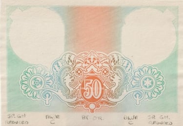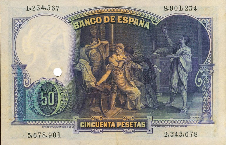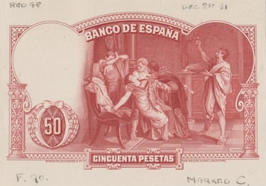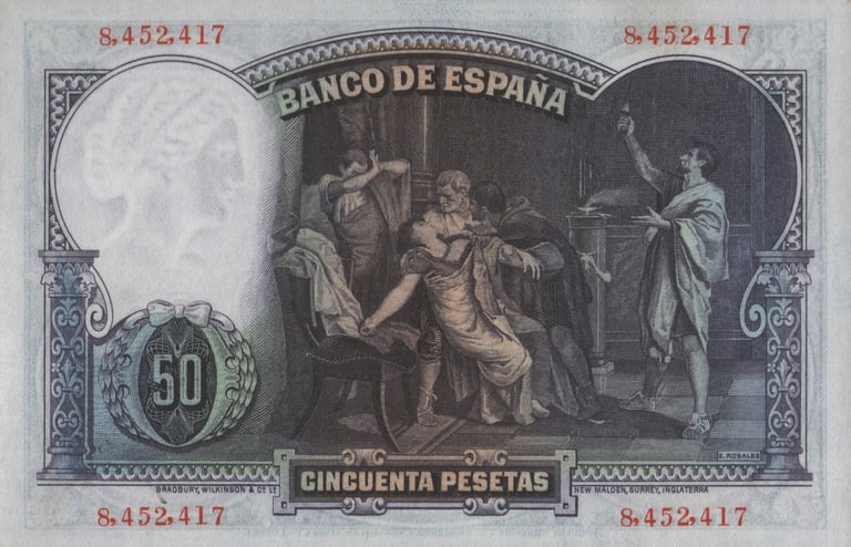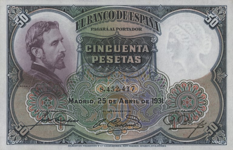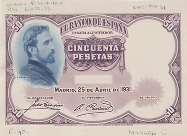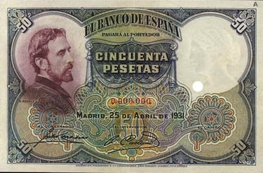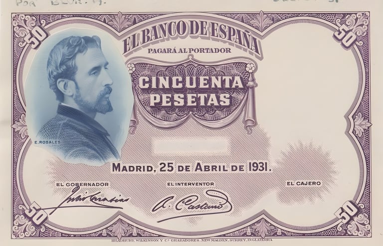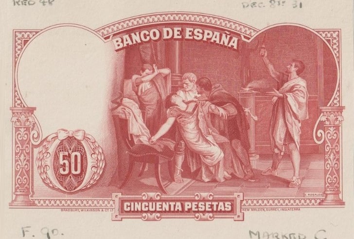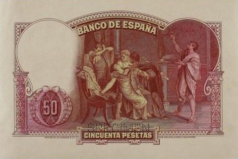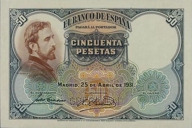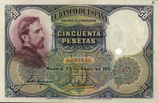 50 pesetas, 25 de abril de 1931. Anverso, cabeza del pintor Eduardo Rosales. Reverso, el cuadro del pintor “La muerte de Lucrecia”. Impreso en calcografía y litografía por Bradbury Wilkinson and Company. Marca de agua: Cabeza de mujer. Tamaño: 131 x 85 mm.