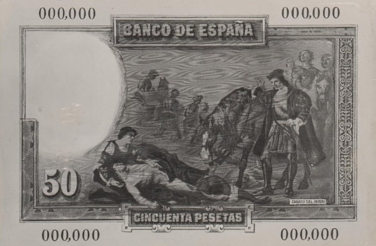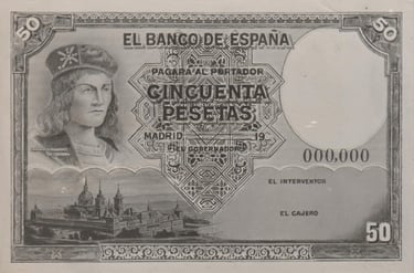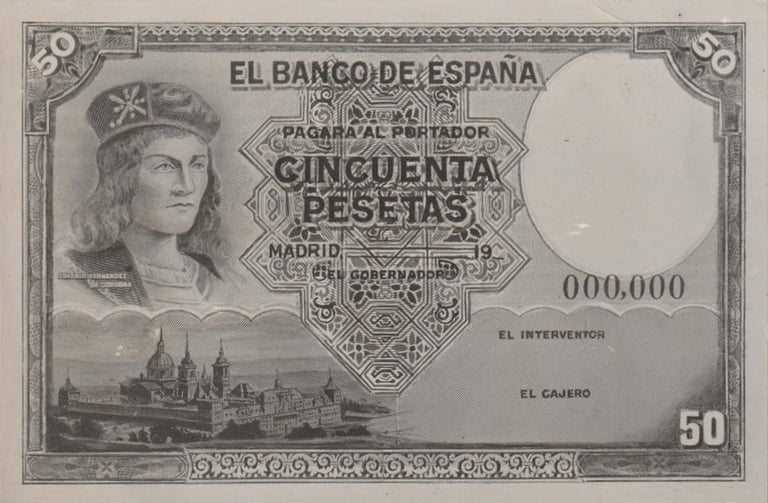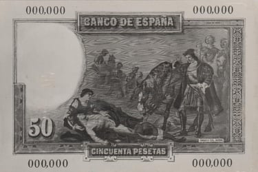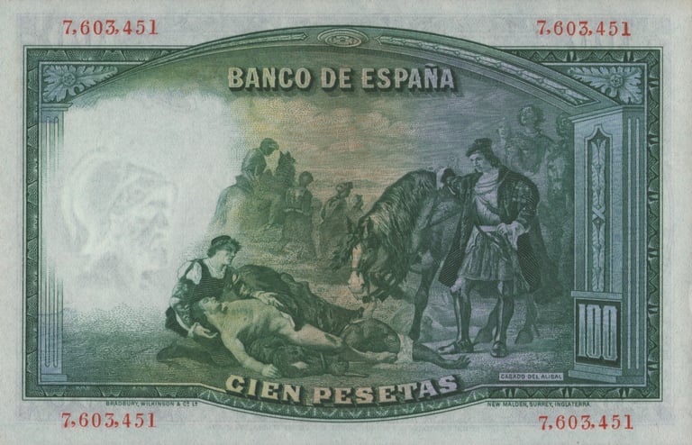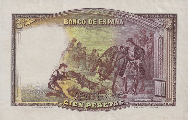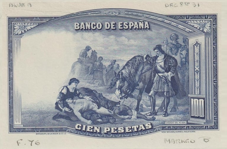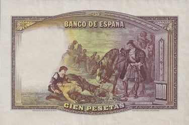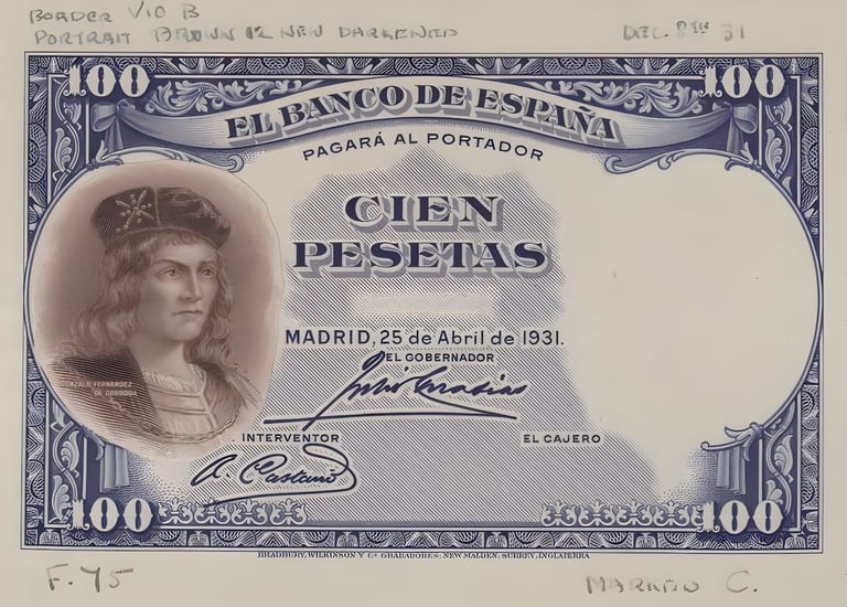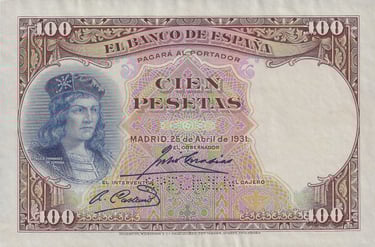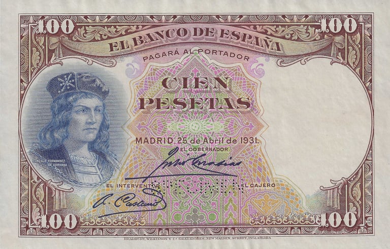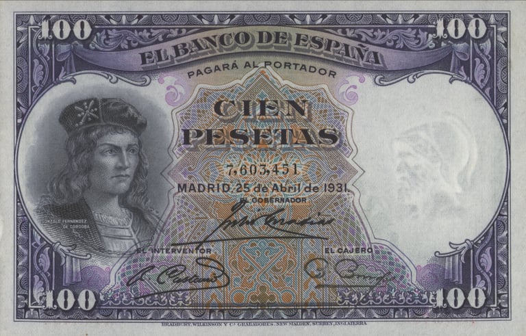 100 pesetas, 25 de abril de 1931. Anverso, Gonzalo Fernández de Córdoba. Reverso, el cuadro de Jose Casado del Alisal “El Gran Capitán, la batalla de Ceriñola”. Impreso en calcografía y litografía por Bradbury Wilkinson and Company. Marca de agua: Cabeza de guerrero con yelmo.
