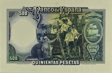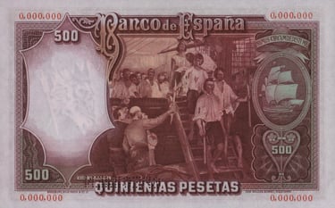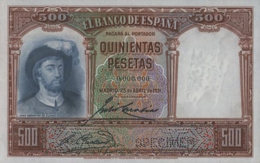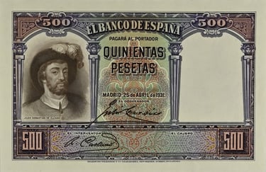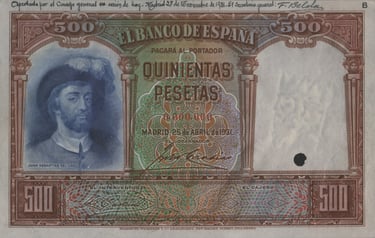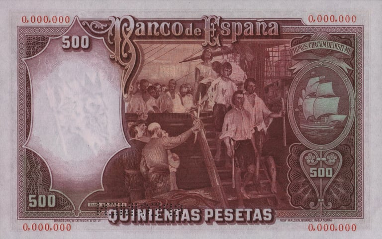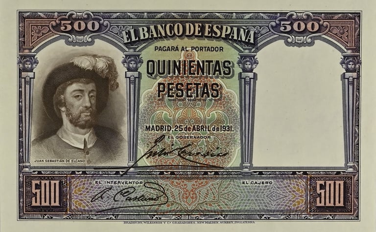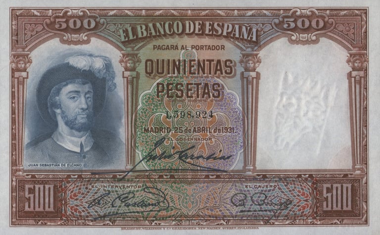 500 Pesetas500 pesetas, 25 de abril de 1931. Anverso, retrato de Juan Sebastián Elcano. Reverso, cuadro de Elías Salaverría “Desenbarco de Elcano en Sevilla después de dar la vuelta al mundo” y nao “Victoria”. Impreso en calcografía y litografía por Bradbury Wilkinson and Company. Marca de agua: Cabeza de Neptuno. Tamaño: 151 x 95 mm. Tirada: 2.000.000.