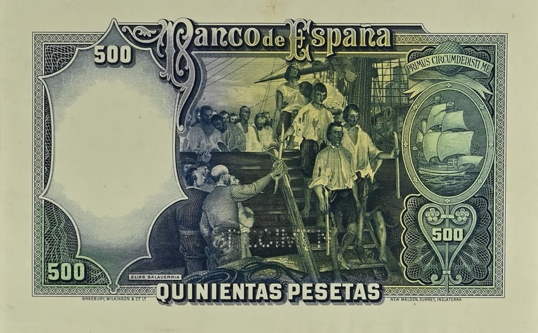 500 pesetas, 25 de abril de 1931. Anverso, retrato de Juan Sebastián Elcano. Reverso, cuadro de Elías Salaverría “Desenbarco de Elcano en Sevilla después de dar la vuelta al mundo” y nao “Victoria”. Impreso en calcografía y litografía por Bradbury Wilkinson and Company.