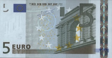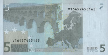 5 euro, 2002, Jean-Claude Trichet. Anverso, arco de arquitectura clásica. Reverso, un mapa de Europa y un puente de la era clásica. Emisor, el Banco Central Europeo. Marca de agua: Arquitectura clásica. Diseñado por Robert Kalina, del Banco Nacional de Austria.
