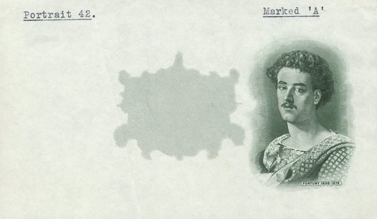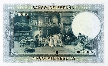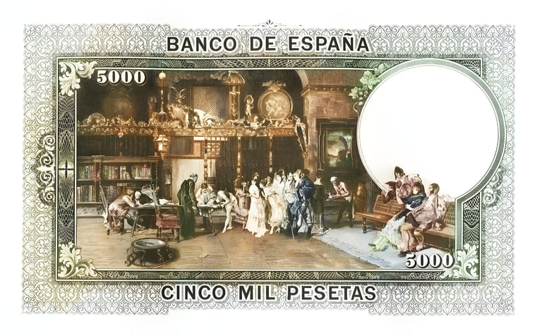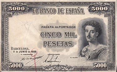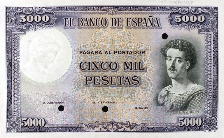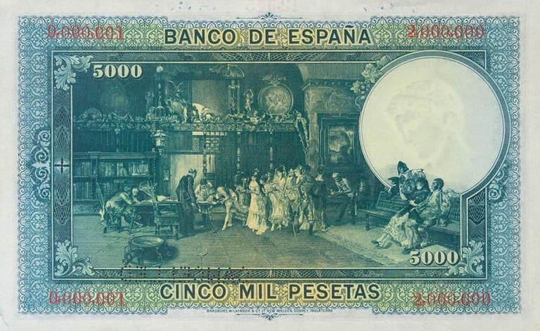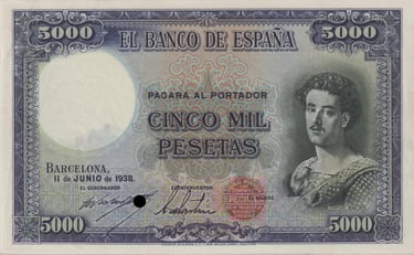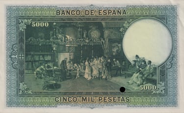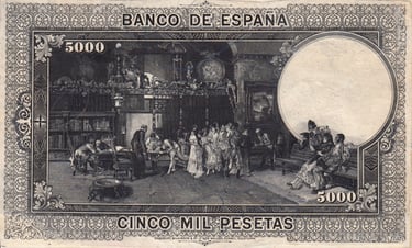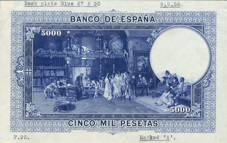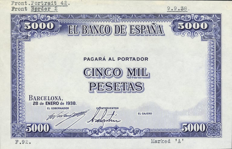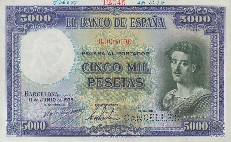 5000 Pesetas5000 pesetas, 11 de junio de 1938. Anverso, retrato del pintor Mariano Fortuny. Reverso, “La Vicaria”, cuadro que realizo el mismo Mariano Fortuny. Impreso en calcografía y litografía por Bradbury, Wilkinson and Company. Marca de agua: cabeza clásica. Tamaño: 173 x 108 mm. Tirada: 2.000.000. Circulación: No circulo.